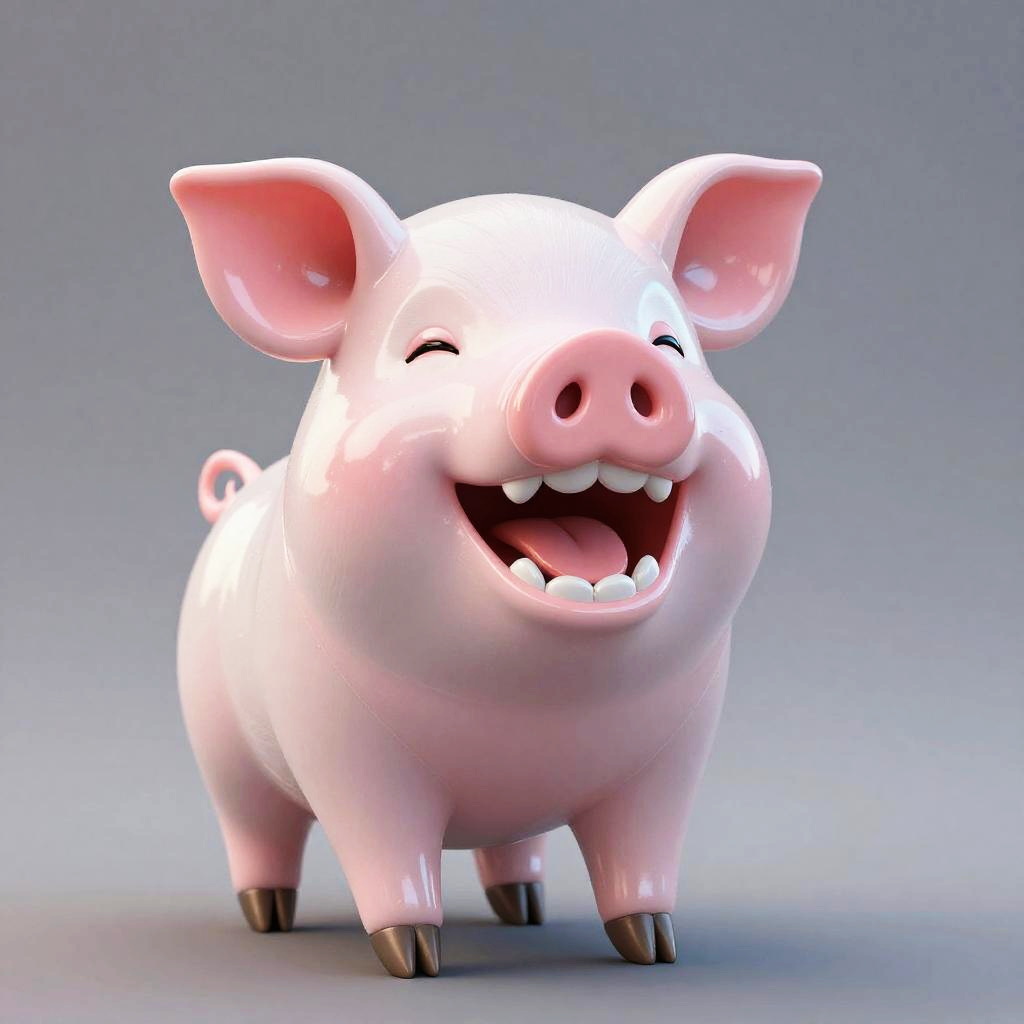 A shiny, wild iridescent coral plushie Piglet with a cute, chubby body and a wide-open mouth filled with white, rounded teeth and a pink tongue. Its eyes are small and slightly closed, and it has a small fin-like structure on its back. The background is a simple, gradient gray, highlighting the creature's glossy texture and vibrant color. The overall style is whimsical and playful.