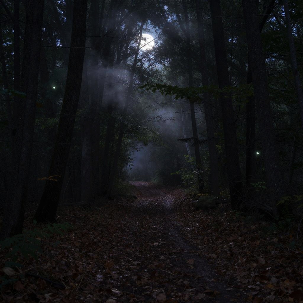 Real forest at night with a narrow winding path covered in fallen leaves, silver moonlight breaking through thick canopy, faint fog swirling around tree trunks, subtle glowing eyes of nocturnal animals peeking, photorealistic nature landscape.
