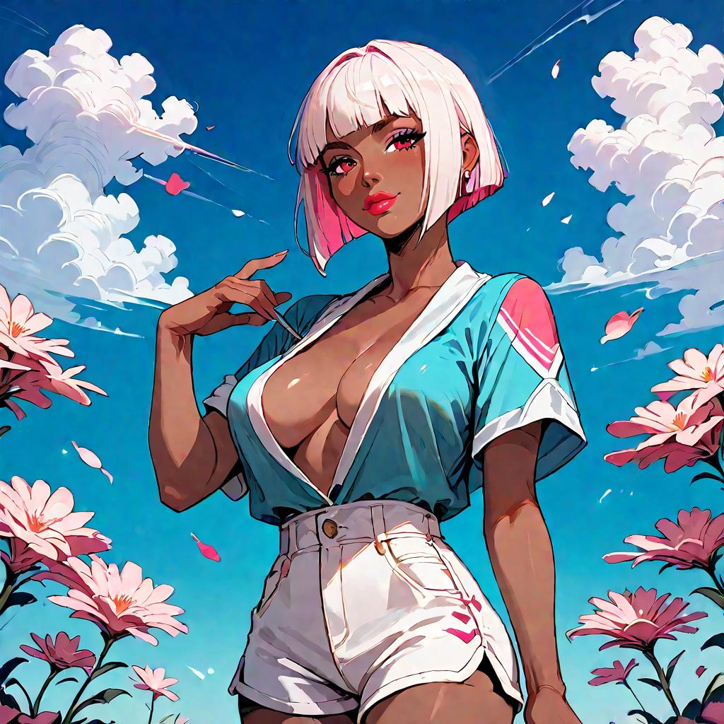 This digital illustration features a dark-skinned woman with a short, white bob haircut with pink highlights, standing in a vibrant, sunny field of pink flowers. She has large, expressive pink eyes and full red lips. She is wearing a low-cut, turquoise top that reveals significant cleavage, paired with high-waisted white shorts with a belt. The background is a bright blue sky with scattered white clouds. Her left hand is raised, gently touching her chin, while her right arm rests by her side. The style is reminiscent of modern, colorful comic art, with bold lines and vivid colors.