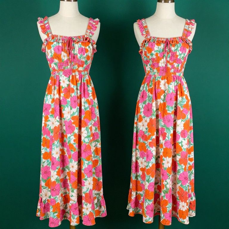 Two vintage 1970s hippie floral maxi dresses with babydoll empire waists are displayed side by side on mannequins, showcasing vibrant patterns of pink, orange, and white flowers against a dark green background.