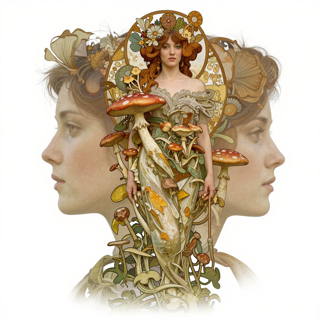 A detailed, 3D double exposure of a woman adorned with mushrooms and ornate flowers, reminiscent of Alphonse Mucha's style, set against a white background with intricate details, all in 8k resolution.