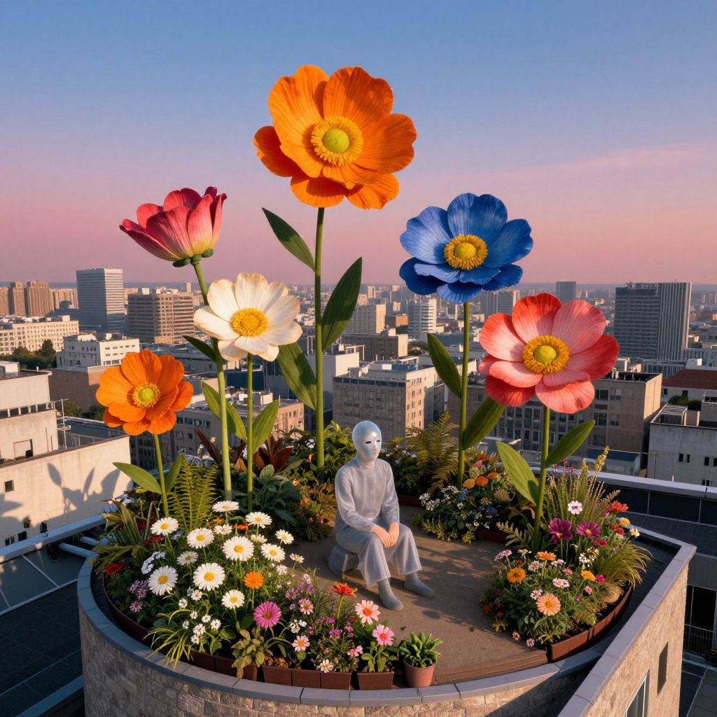 Craft an imaginative scene inspired by Magritte's dreamlike aesthetics, featuring a mysterious figure in a translucent mask sitting amidst a surreal rooftop garden. From an aerial viewpoint, accentuate the juxtaposition between the grounded reality beneath and the fantastical elements hovering above. This composition should intrigue viewers with its unique interplay as oversized, vibrant flowers seemingly defy gravity, casting whimsical shadows across the skyline. The resulting image should evoke curiosity and invite exploration into the vast landscapes of human imagination through its captivating emotional gradient.