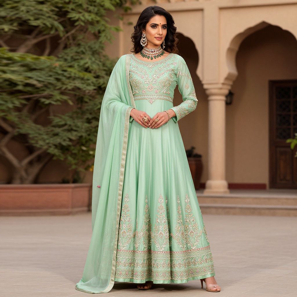 Elegantly styled woman wearing a meticulously embroidered georgette anarkali suit in soft green, complemented by intricate jewelry and flowing dupatta, standing gracefully outdoors against a backdrop of arched doorways and lush greenery.
