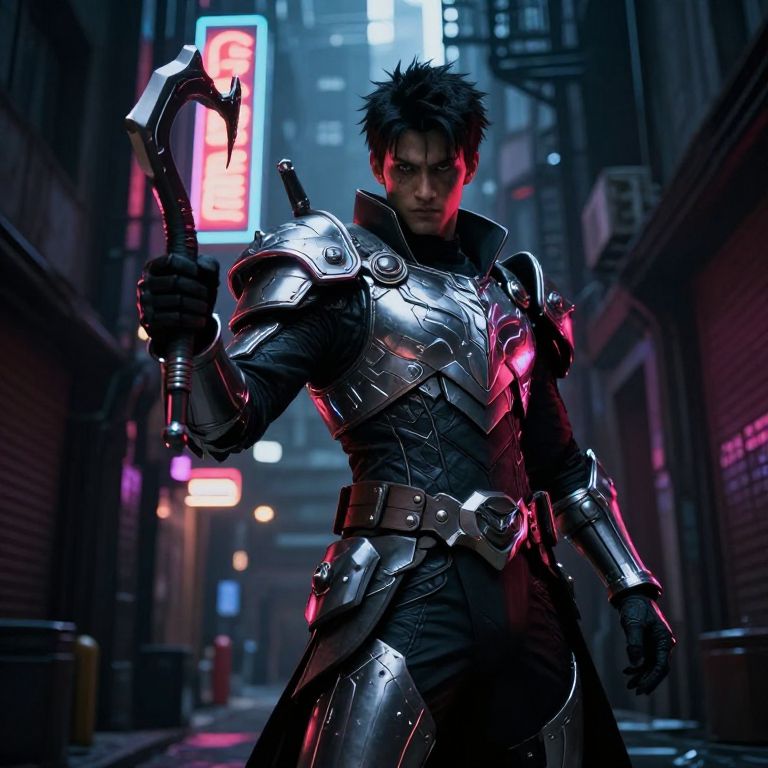 Digital artwork of a muscular, dark-haired male warrior in a neon-lit urban alleyway. He wears shiny, silver armor with red glowing accents and holds a curved, black staff. His intense expression is highlighted by red lighting. The background features tall, dark buildings with glowing red and blue neon signs. The alleyway is narrow with metal fire escapes and a distant fire hydrant. The image has a cyberpunk aesthetic with high contrast and vivid colors.