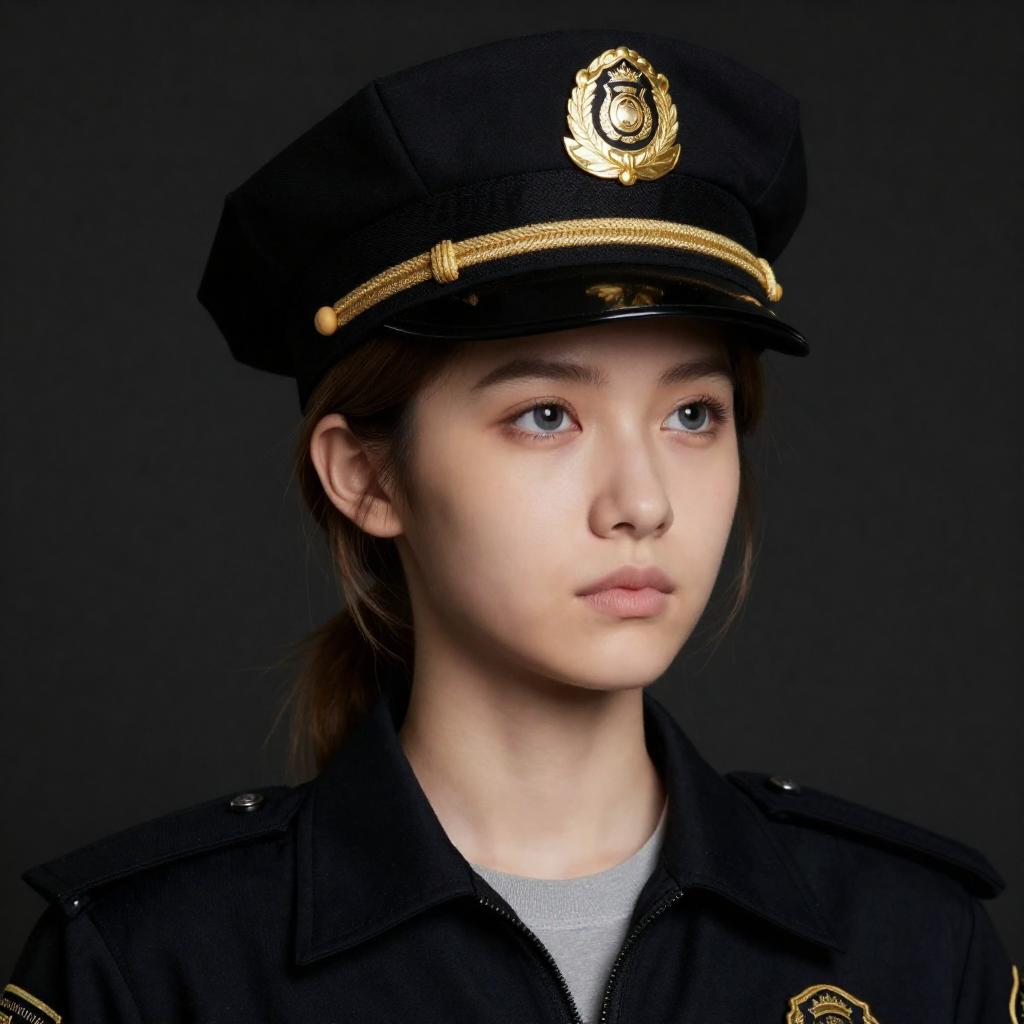 Photograph of a young woman with fair skin and light brown hair, wearing a black police cap with a gold emblem, a black jacket with gold accents, and a gray shirt. She has blue eyes and a neutral expression, looking slightly to the right. The background is dark, emphasizing her face and uniform.