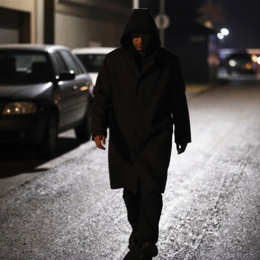 A blurry, dark photograph shows a person walking on a dimly lit street at night. The figure is dressed in a long, dark coat with a hood, and their face is mostly obscured by shadows. A car is parked to the left, and there's a dark structure in the background. The street reflects a bright white light, creating a stark contrast.
