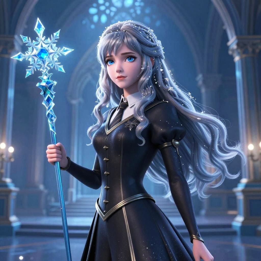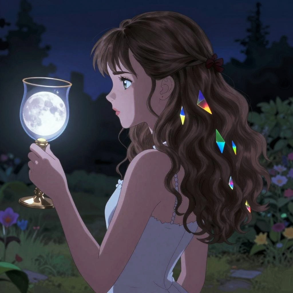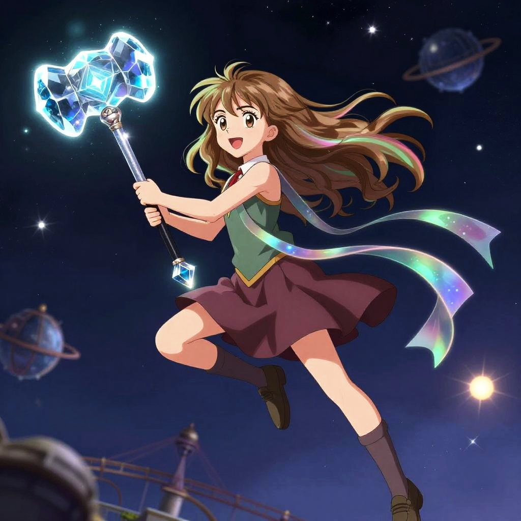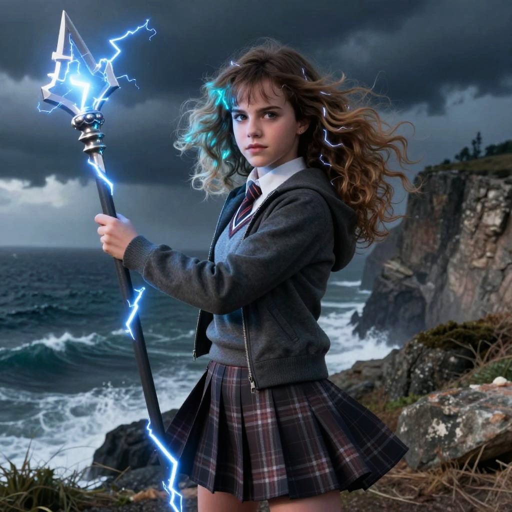 An anime-style Hermione Granger with messy braids wrapped with vines and shimmering emerald sparkles, wielding a nature-infused dagger in overgrown temple ruins.