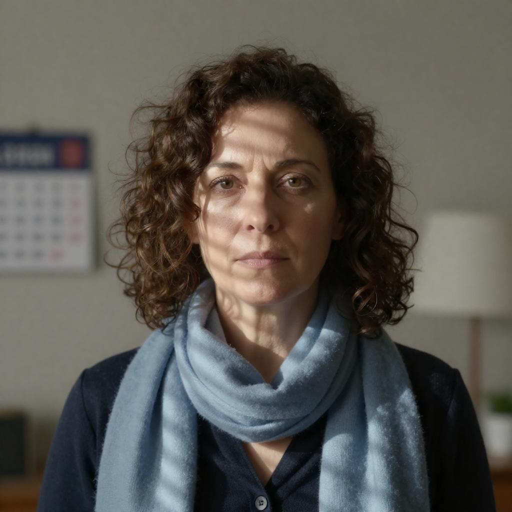 Photograph of a middle-aged woman with shoulder-length brown hair, wearing a dark navy long-sleeve shirt, holding a white envelope with both hands near her chest. Brick wall and framed picture in the background. She has a neutral expression.