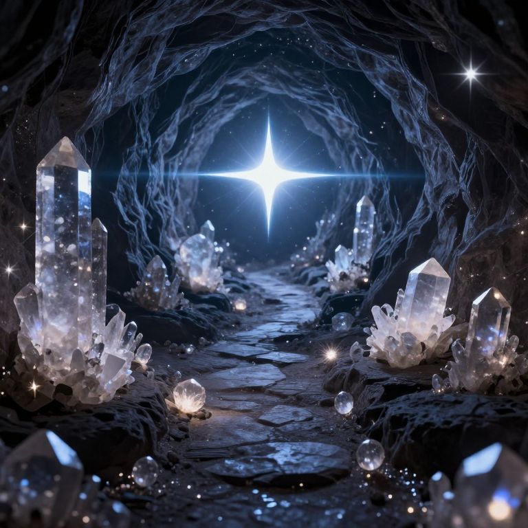 A mesmerizing 3D-rendered fantasy landscape features a glowing, crystalline staircase ascending through a cavernous chasm, illuminated by ethereal light sources that evoke celestial starlight, blending surreal realism with otherworldly ambiance.