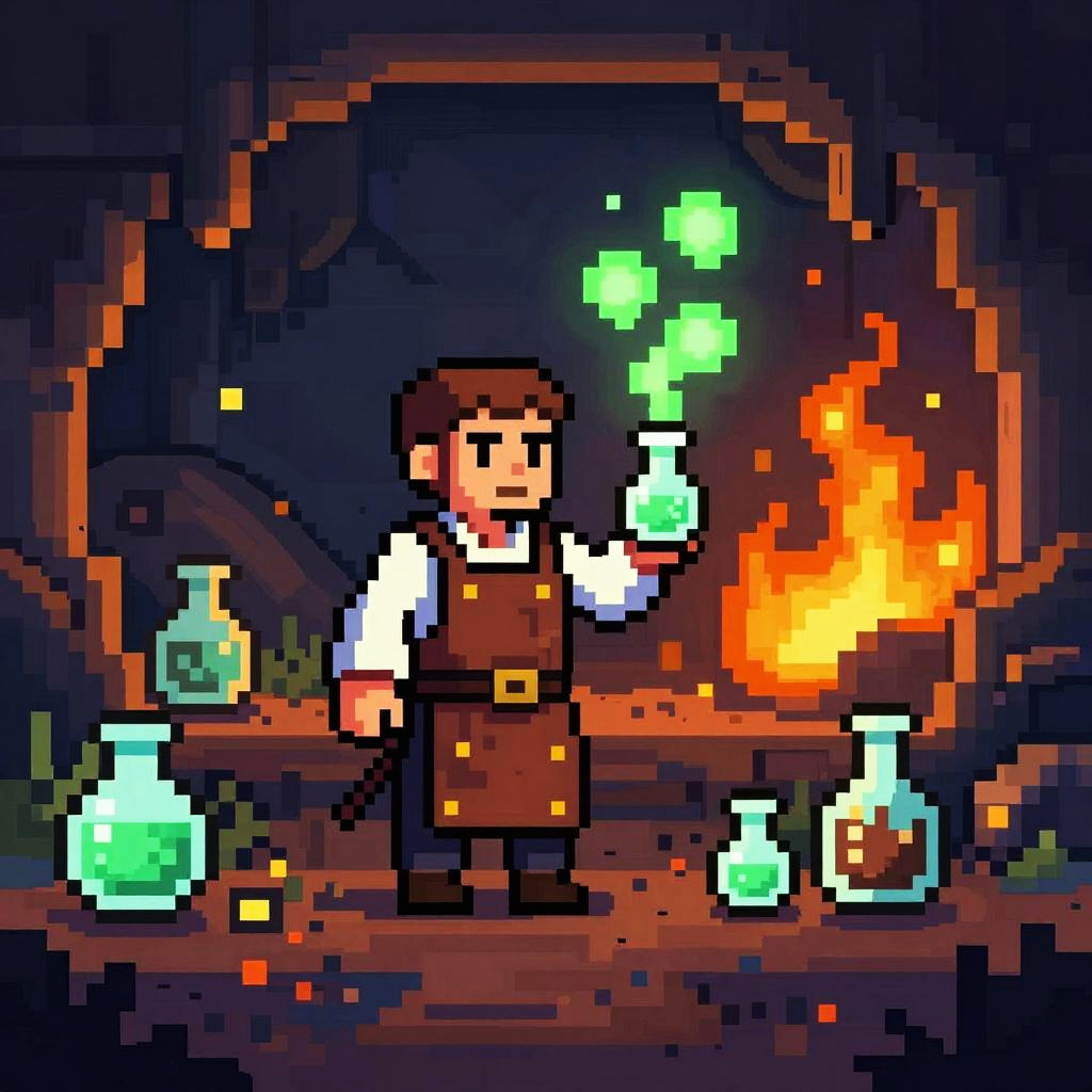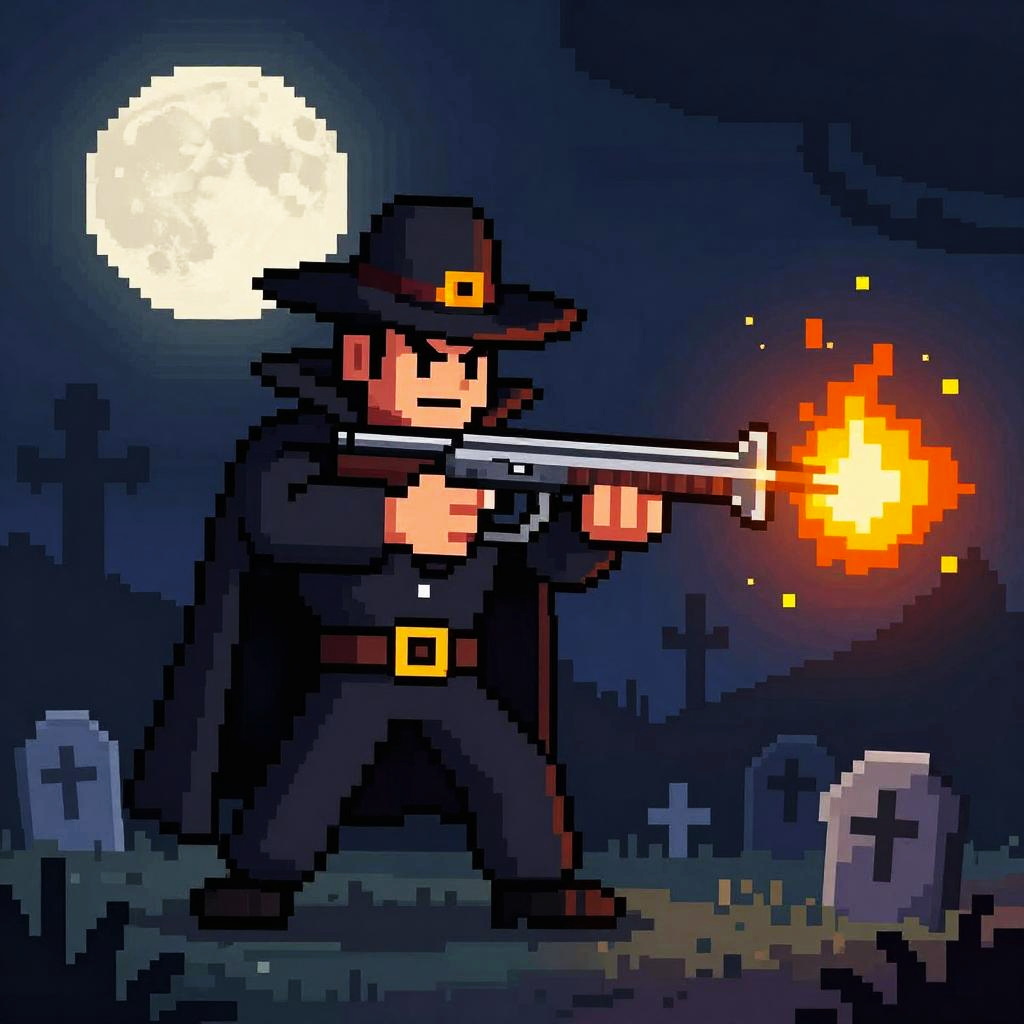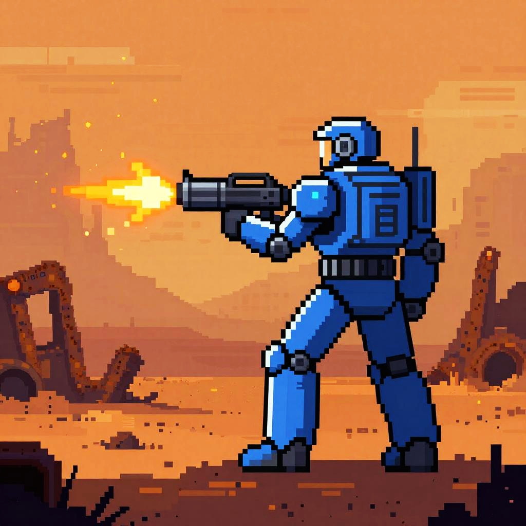 Pixel Art Rebel Mechanic in Junkyard with Flamethrower