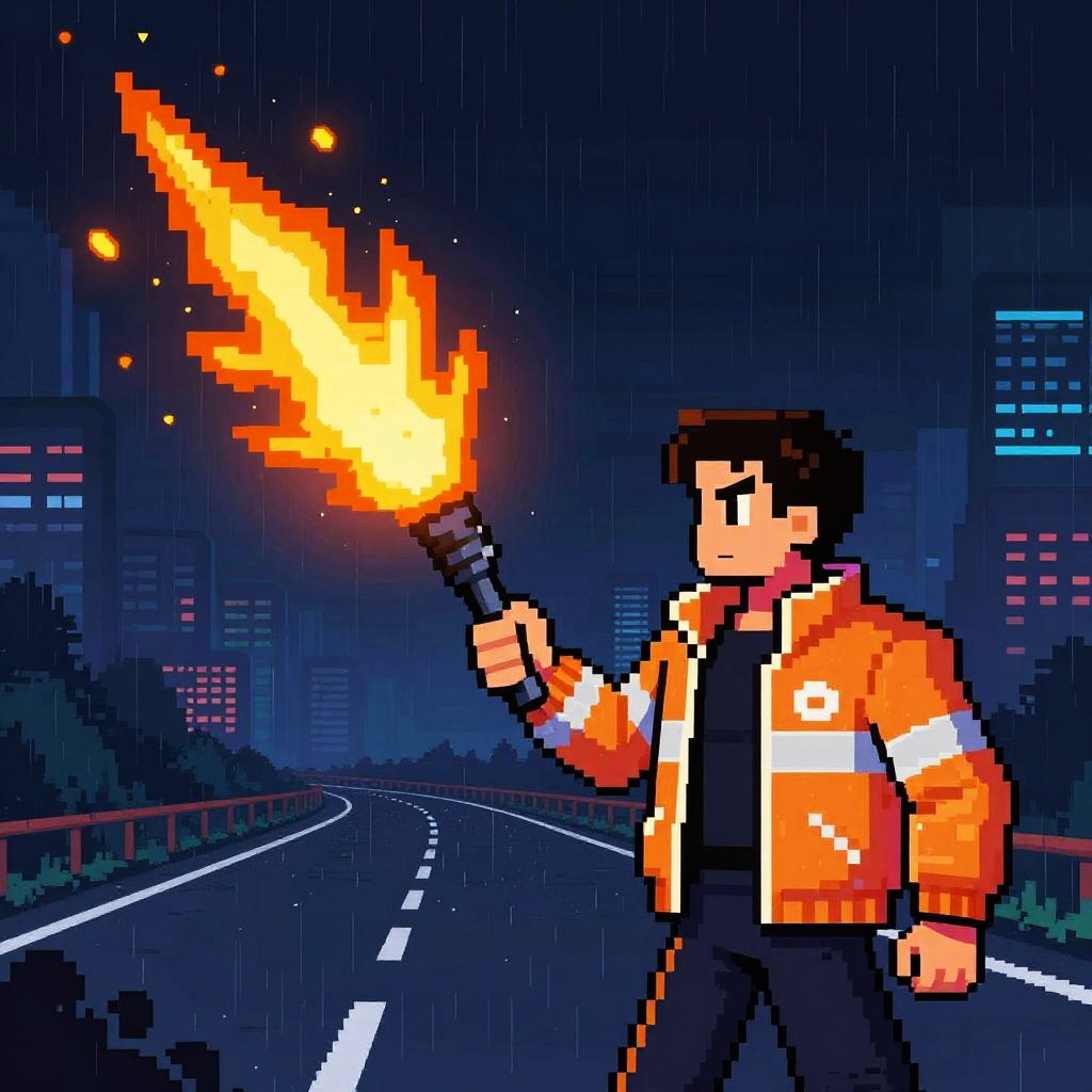 Pixel art scene featuring rebel mechanic covered in grease and bandages, in junkyard filled with derelict vehicles at dusk, holding makeshift flamethrower sparking wildly; fiery orange flames in the background throw hot light and drifting embers, retro game aesthetic, bold black outlines, limited 12-16 color palette, warm orange versus cool blue tones, crisp dithering, CRT scanlines, high contrast rim lighting, parallax hills, minimal HUD, sharp pixel clusters, atmospheric smoke and haze, cinematic composition, nostalgic yet clean