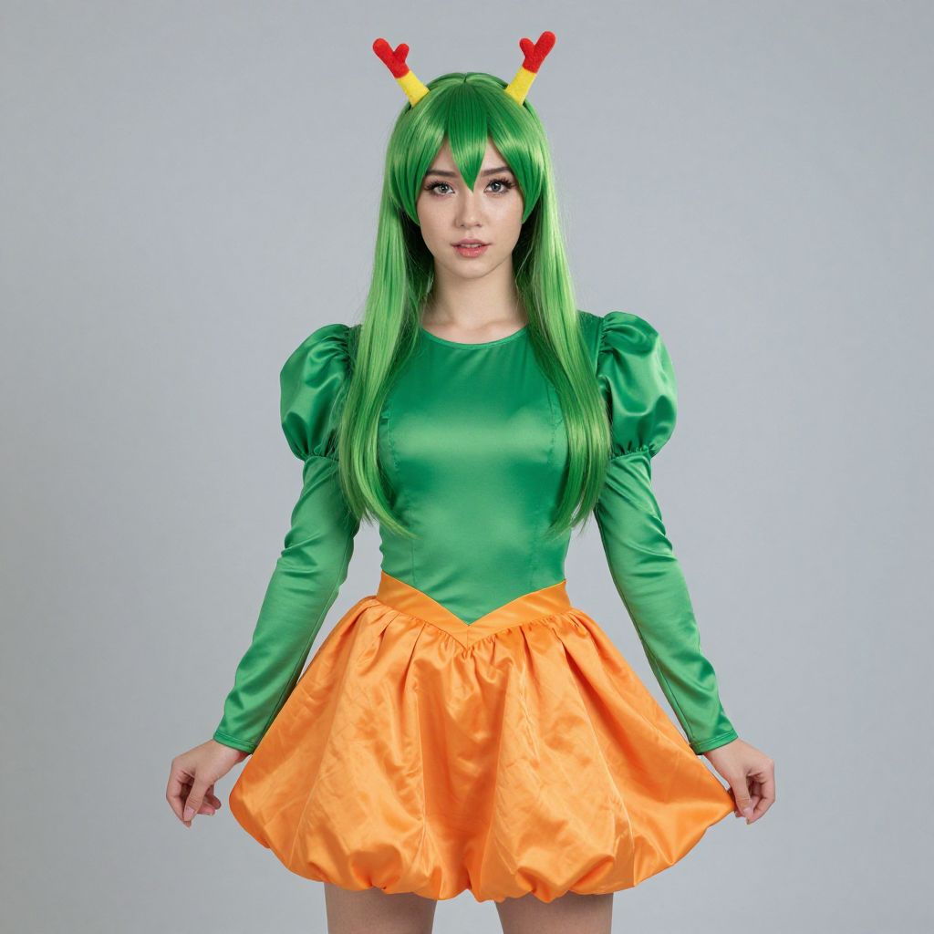Green Rainbow Costume, dressed in a costume with green hair and a bright orange skirt