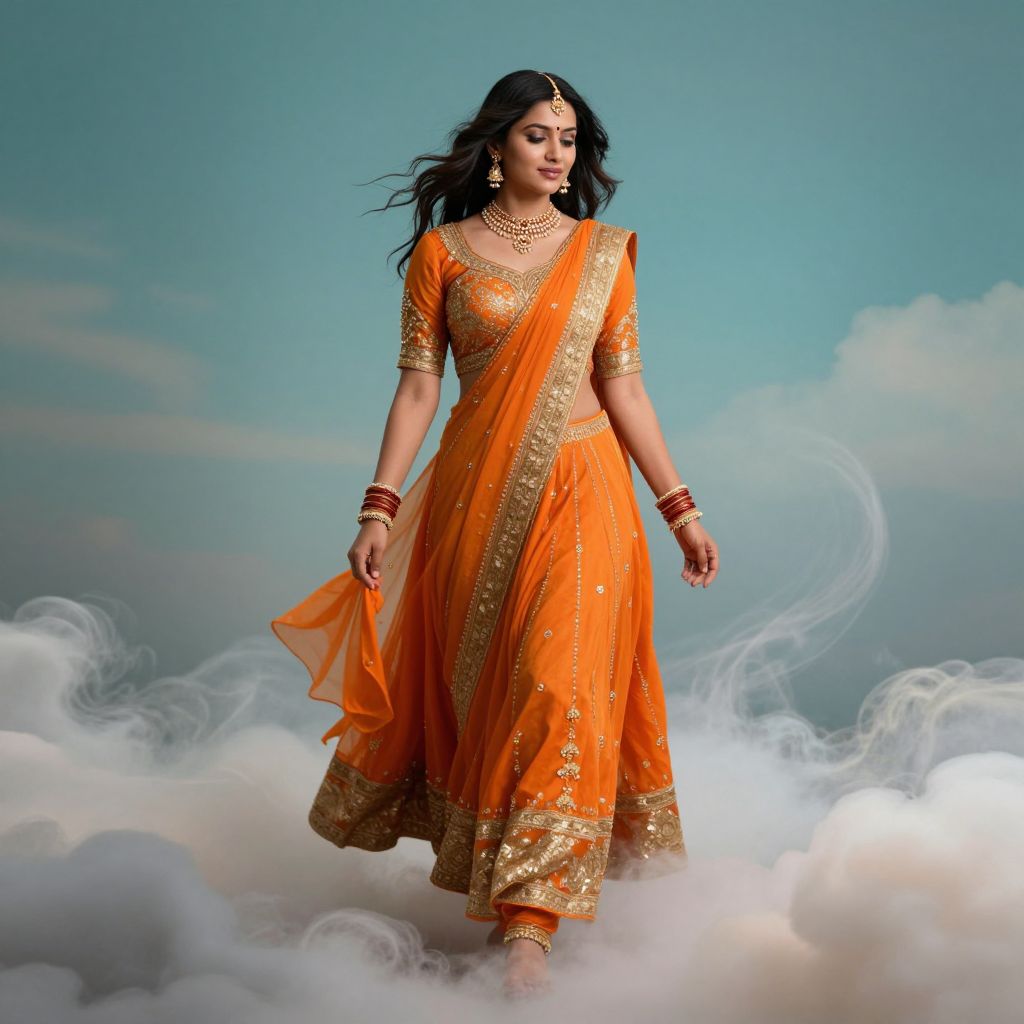 Indian woman gracefully walking amidst swirling clouds, adorned in vibrant orange and gold traditional attire, her flowing hair and jewelry catching the light against a serene teal sky.