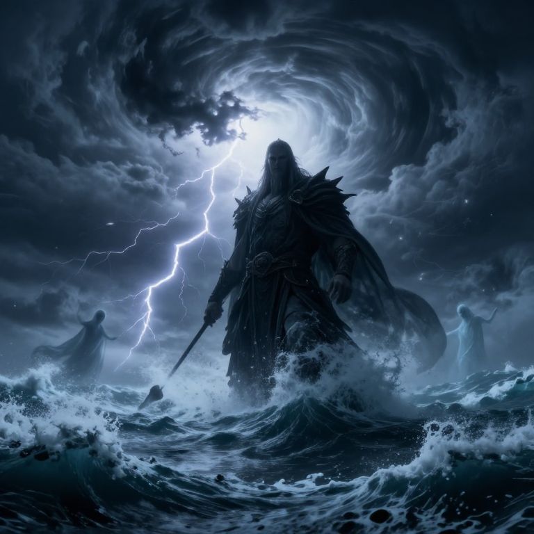 Digital fantasy artwork of a dark, armored figure wielding a sword, standing in turbulent waves under a swirling, lightning-filled stormy sky.