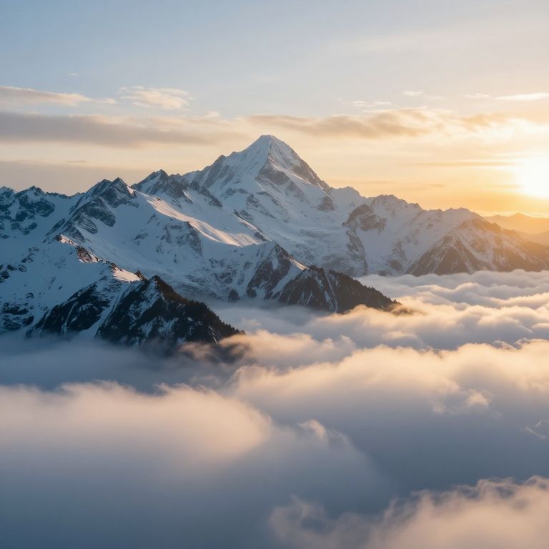 A majestic, snow-capped mountain range emerges triumphantly above a sea of clouds, bathed in the ethereal glow of golden-hour sunlight, evoking a dreamlike, computer-generated landscape where imagination reshapes the natural world.