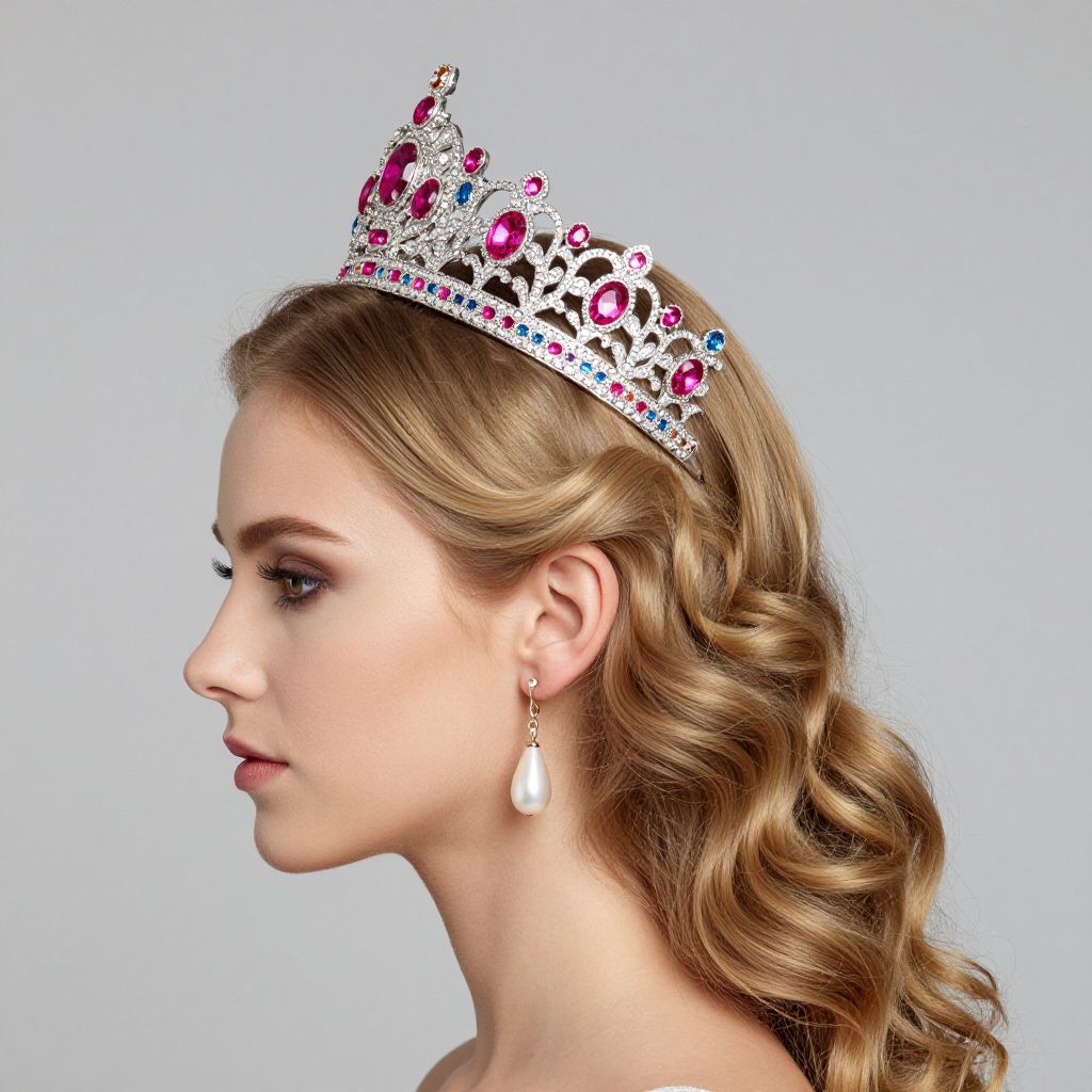 Elegant profile of a woman adorned with a sparkling princess tiara featuring intricate floral designs in silver, accented with vibrant pink and blue gemstones, complemented by a delicate pearl earring and flowing golden hair styled in soft curls.