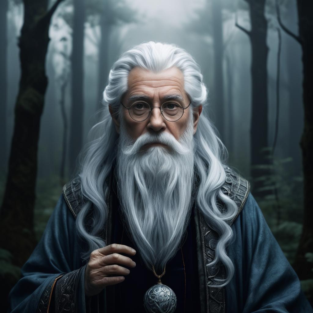 Portrait of a wise old wizard with silver hair, art inspired by Elena Gordon, a foggy forest.