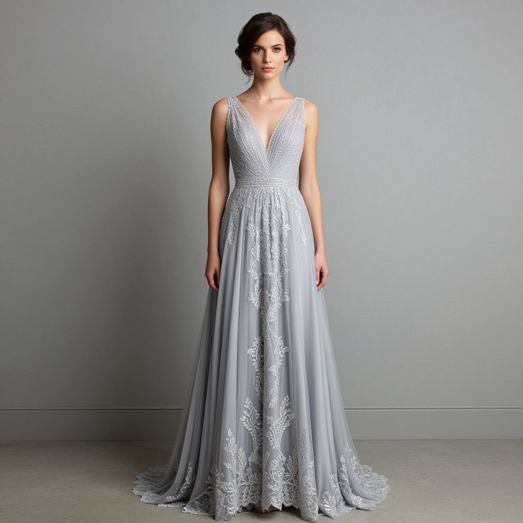 Woman in Elegant Grey Wedding Dress