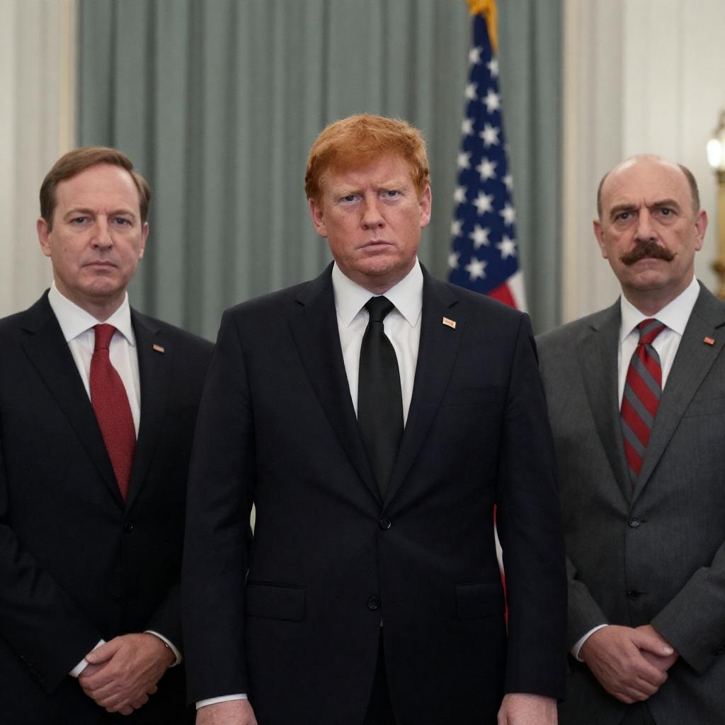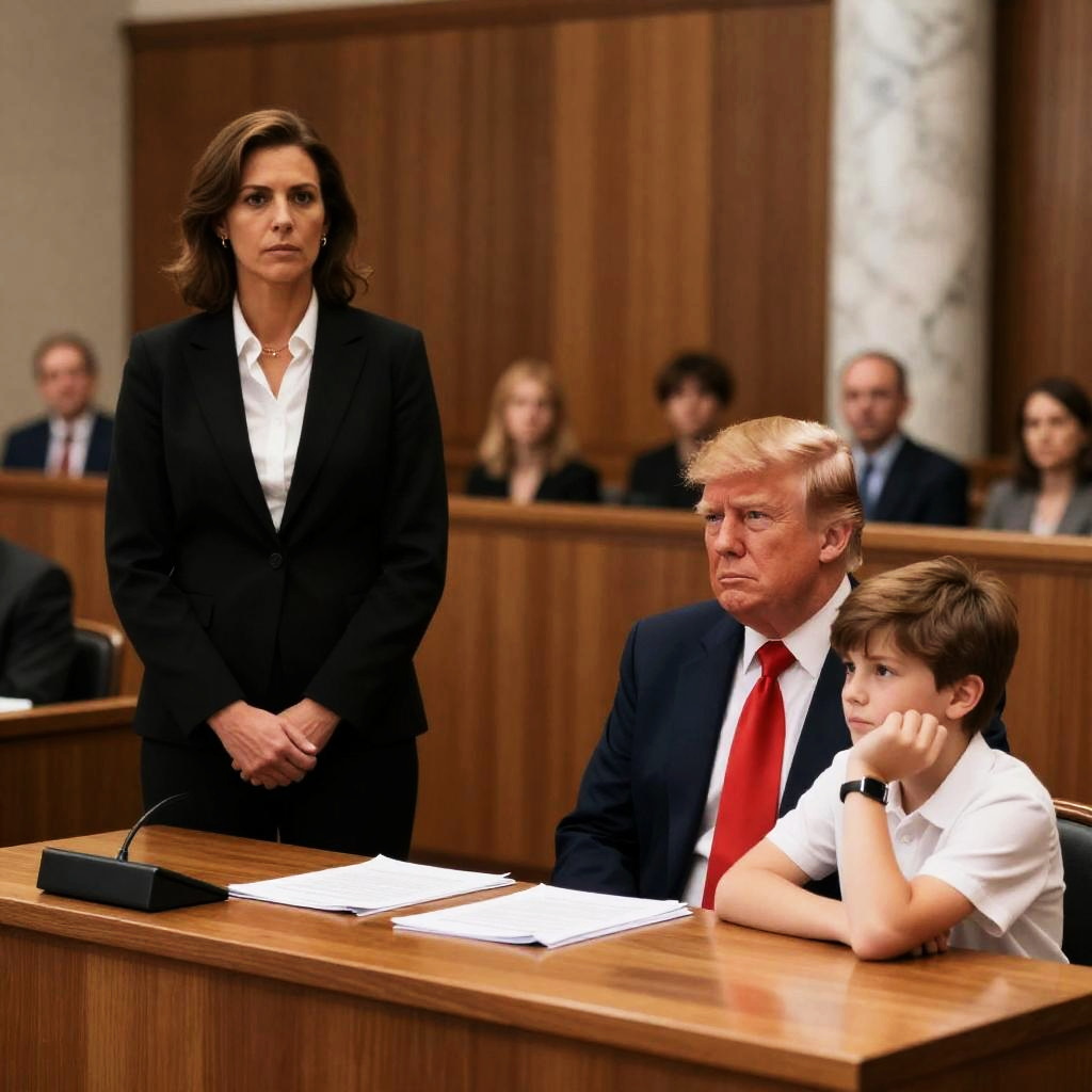 Photograph of a courtroom. Woman in black suit stands at the front, hands clasped. Man with blonde hair and red tie sits at a wooden table with papers. Boy with brown hair and white shirt sits next to him, resting chin on hand. Wood-paneled walls, marble columns, seated audience in the background. Intense expressions on woman and man.