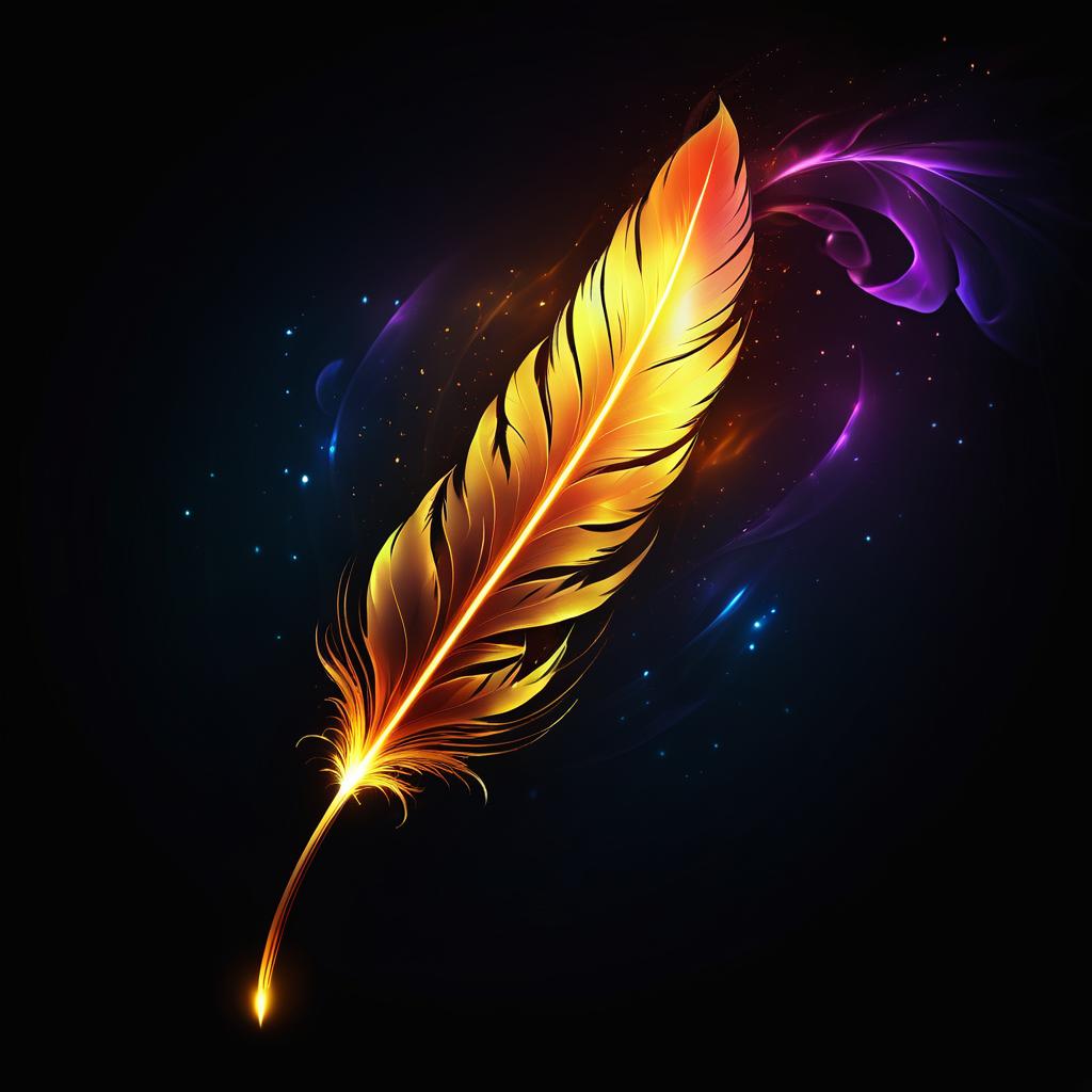 A digital illustration featuring multiple mystical phoenix feathers with intense glowing effects in vibrant colors such as blue, purple, green, yellow, and orange, set against a dark background. The feathers have intricate details and radiant light emanating from their stems and edges, creating a magical and ethereal appearance.
