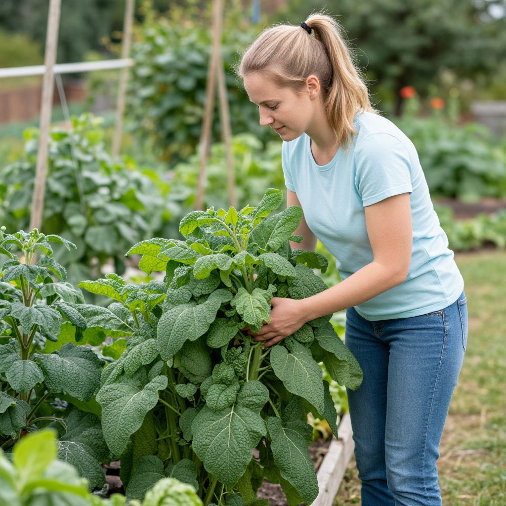 Photograph of a blonde woman with a ponytail, wearing a light blue shirt and jeans, tending to lush green kale plants in a garden.