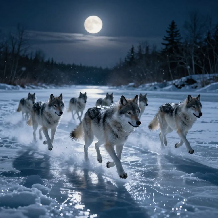 Photograph of six wolves running through a snow-covered landscape at night, illuminated by a full moon. The wolves, with gray and white fur, are mid-stride, creating splashes of water on the partially frozen surface. Their expressions are focused and determined. The background features dark, snow-laden trees under a clear, blue night sky. The moon casts a bright, white glow over the scene, enhancing the icy blue reflections on the snow. The wolves' fur appears fluffy and textured, contrasting with the smooth, glistening snow.