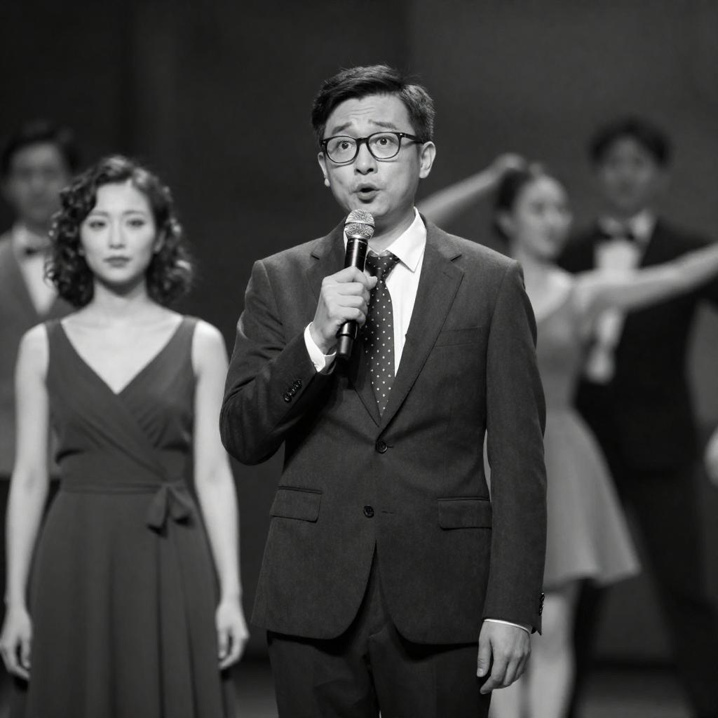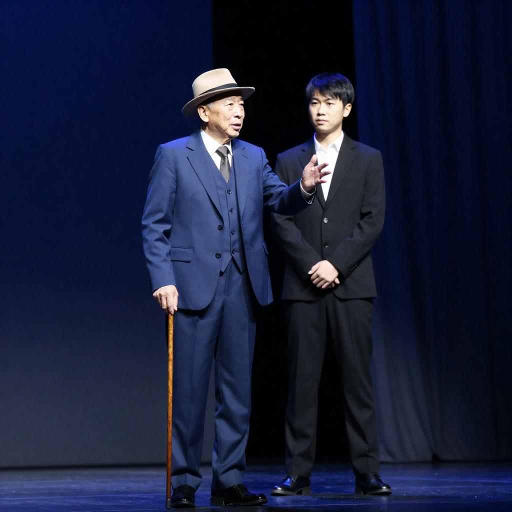 Photograph of a stage performance featuring two men. The older man in a blue suit, beige hat, and holding a cane stands in the foreground, gesturing with his right hand. The younger man in a black suit stands behind him, holding his hands together. Dark blue curtains frame the background, with a spotlight illuminating the stage.