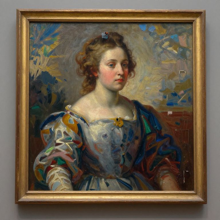 Inpainting AI technology seamlessly restoring missing parts of a historic painting, vibrant brush strokes blending naturally, digital art style, high detail, surreal lighting, museum ambiance with soft shadows, ultra-realistic textures.