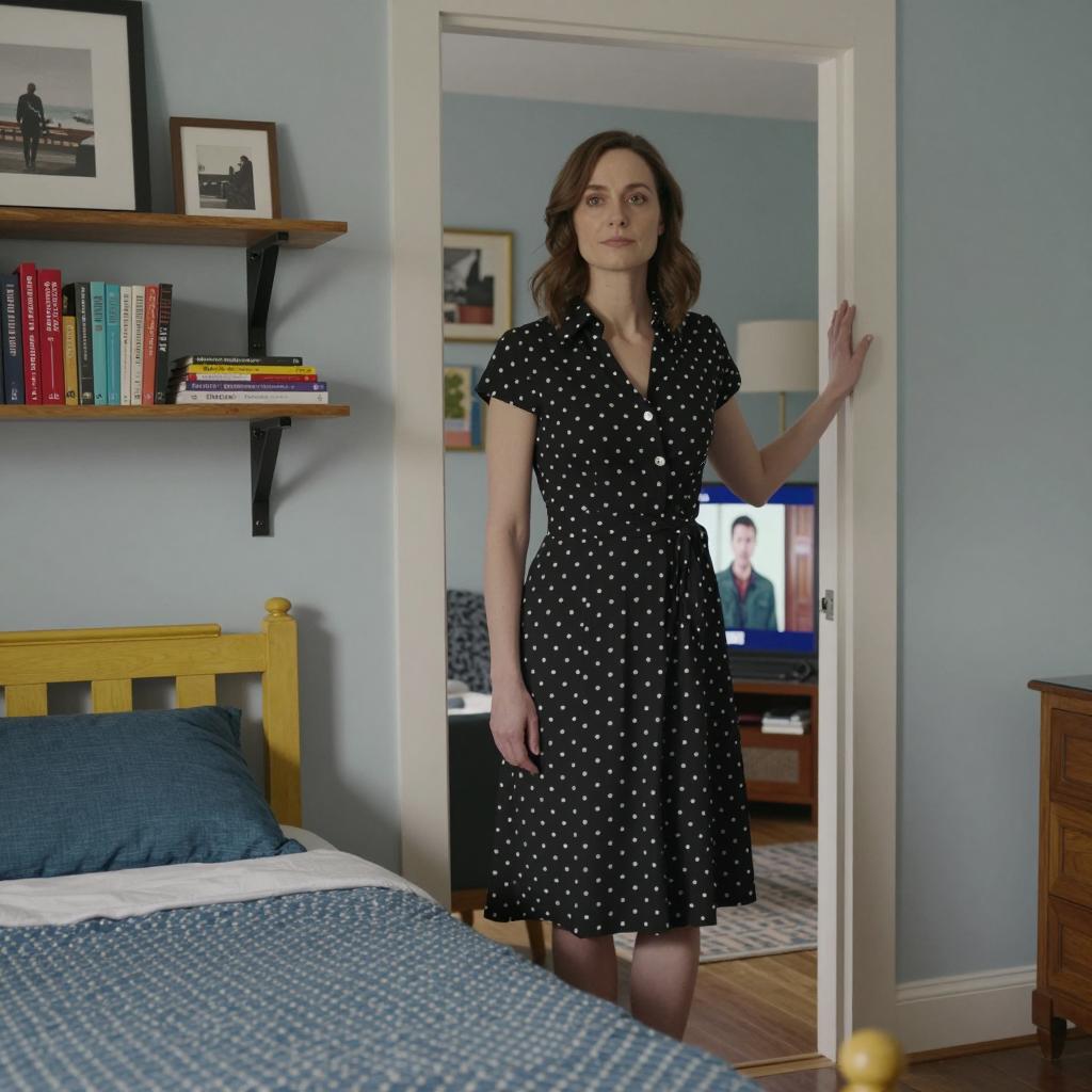 Woman with brown hair in black polka dot dress stands in doorway, right hand on door frame. She has a neutral expression. Living room in background with shelves, books, framed pictures, lamp, and TV showing man in doorway. Blue-patterned bedspread in foreground. One blue pillow on bed. Yellow wooden bed frame.