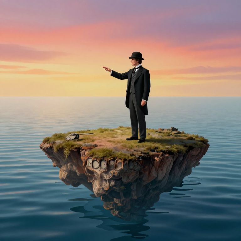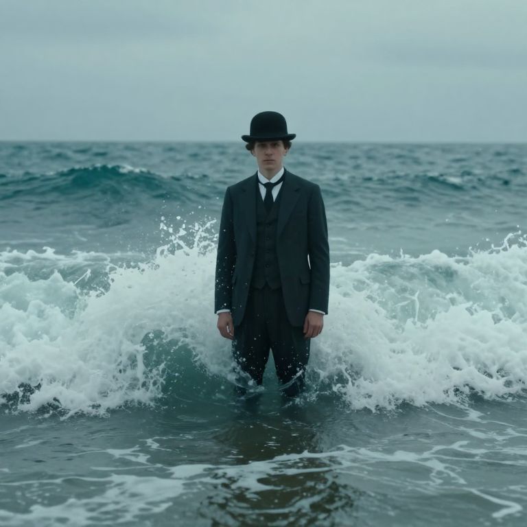 Create an image in the surrealistic vein of René Magritte, depicting a mannequin perched at the precipice of a cliff above a tumultuous sea. Capture this ordinary object in an extraordinary setting from an unconventional perspective, as if viewed from the ground level looking up towards the mannequin and the crashing waves that seem to merge with its base. Evoke a serene yet mysterious mood that blurs the boundaries between reality and fantasy, where the mannequin simultaneously feels out of place and perfectly suited to this dramatic landscape. Invite viewers to question the deeper meaning behind this enigmatic scene, sparking curiosity and wonder as they contemplate the juxtaposition of the mundane with the awe-inspiring.