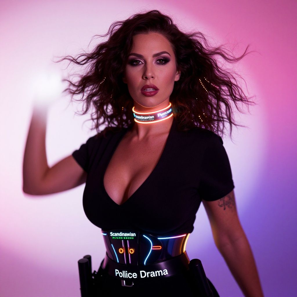 Style: "Scandinavian Police Drama". Type of shot: "upper body", "dynamic pose", "head just turned", "moving hair", "rule of thirds" portrait.Subject: "45yo hot sexy attractive Swedish Woman, hooked to the look, busty".Action: "staring at the viewer with moving expression".Aesthetic: "Black-light photography".Light: "Dark. Night. Nightly. Moon".Season: "End Of Winter, shortest day of the year".Special Effects: "Glowing bio-luminescent multi-color lights hair ", "neon glowing down multi-color choker", "neon glowing multi-color futuristic minimalist outfit".Background:"Pink, White and Purple gradients, blurred, sexy".Makeup: "Barbie doll style aesthetic makeup".By "Simon Stalenhag".Life-like details.Cinematic. Dramatic. Dynamic. Extremely refined lines and and shapes.Extremely refined details on objects.Sharp details.Wide range of colors.Many details everywhere. Ray-Tracing. Anti-Aliasing. Realistic soft shadows. Low saturation colors. Insane quality. Insane resolution. Insane details. Masterpiece. 32k resolution.