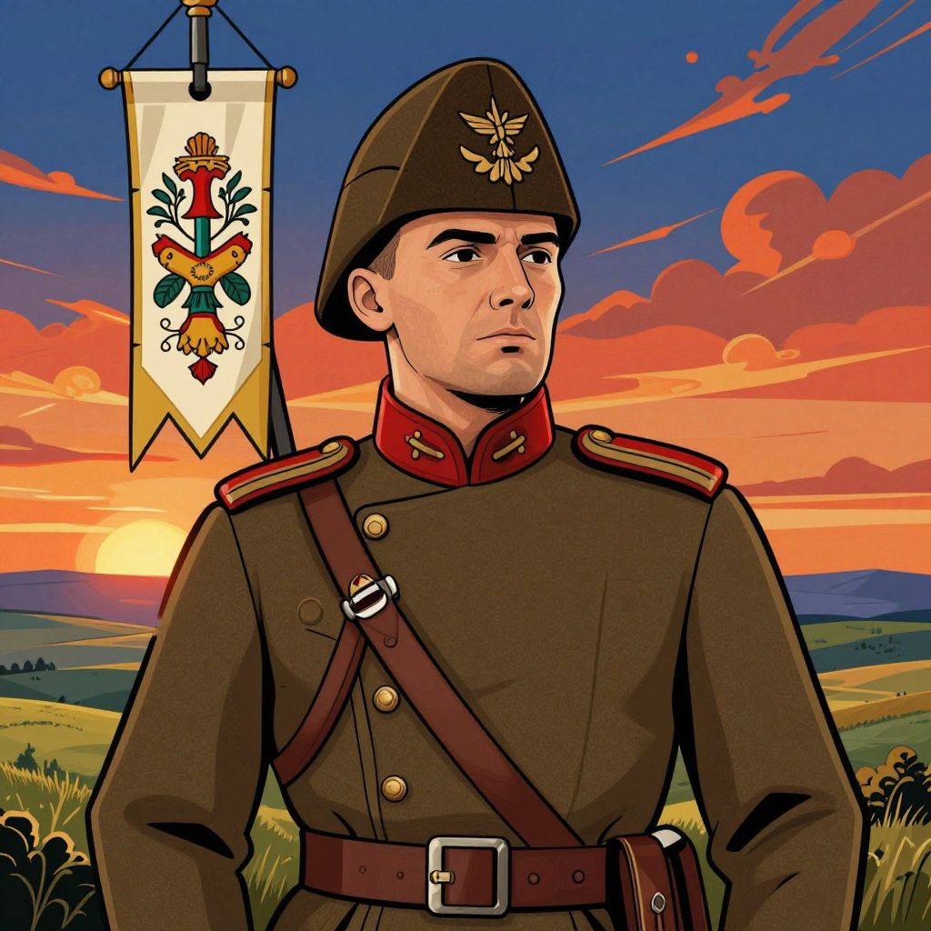 This digital illustration depicts a stern-faced young man in a dark brown military uniform with red accents, including a red collar and shoulder epaulettes. He wears a matching brown hat with an emblem. A brown crossbody strap runs diagonally across his chest. In the background, a vibrant sunset with orange and red clouds illuminates a green field and distant hills. A white banner with a colorful heraldic emblem hangs on the left side of the image, partially visible. The art style is reminiscent of comic book illustrations, with bold lines and vivid colors.