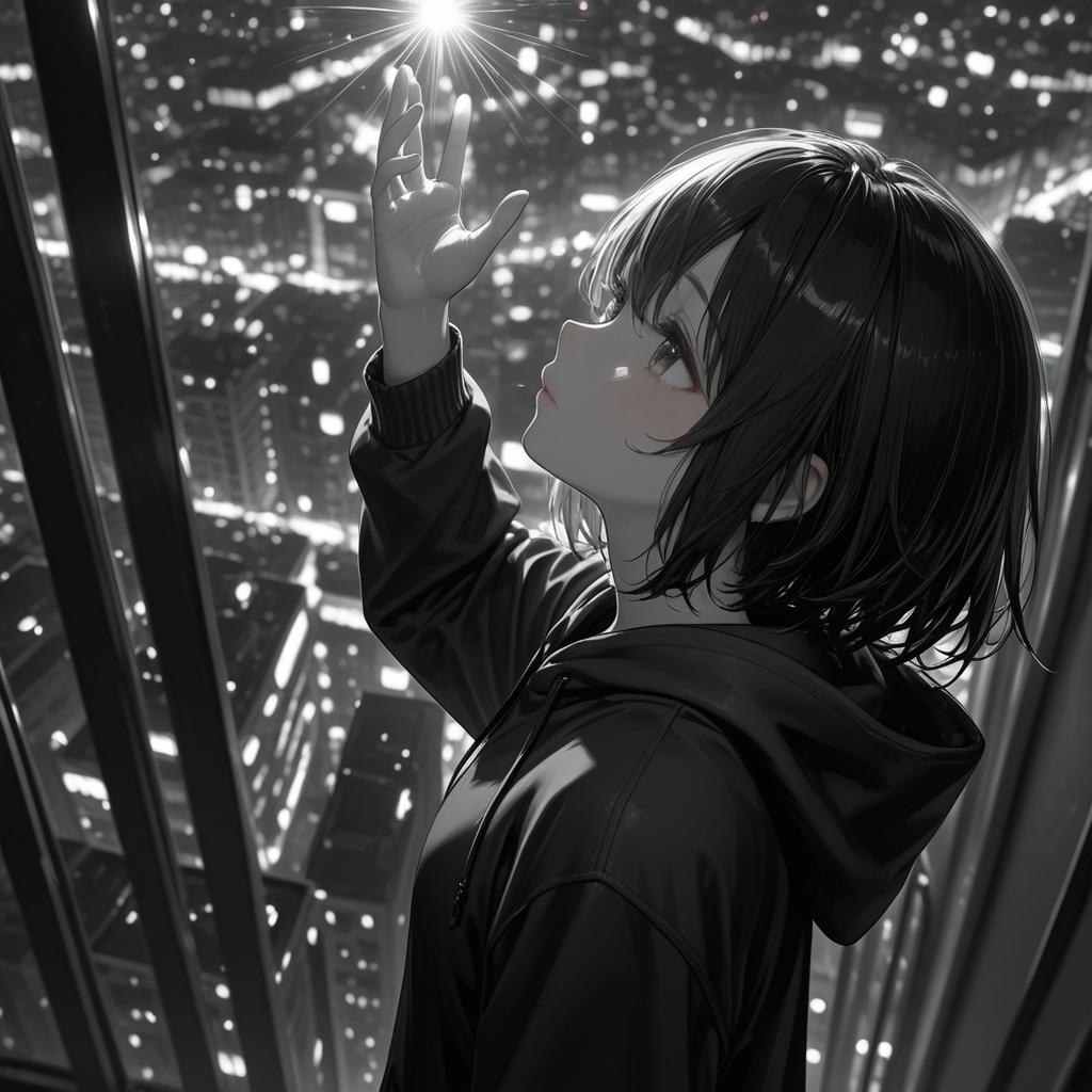 1girl, manga, medium shot, looking up, sideways view, hoodie, short hair, solo, (city background, lights, blurred:1.2), greyscale, monochrome, detailed face