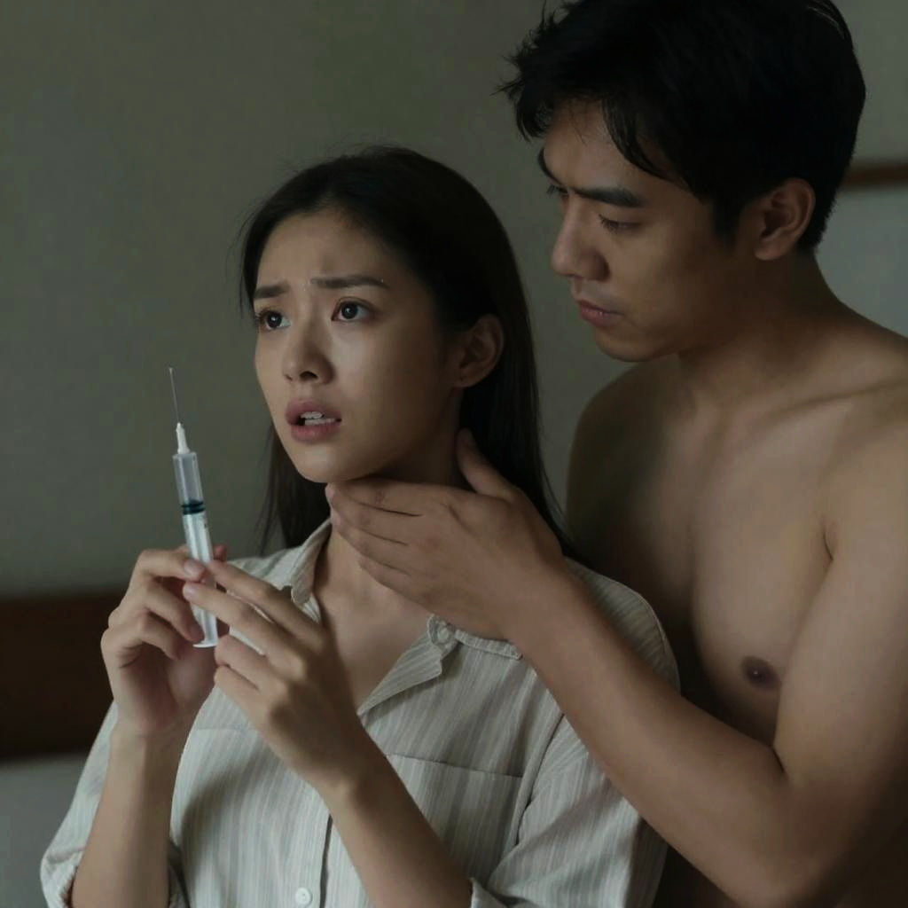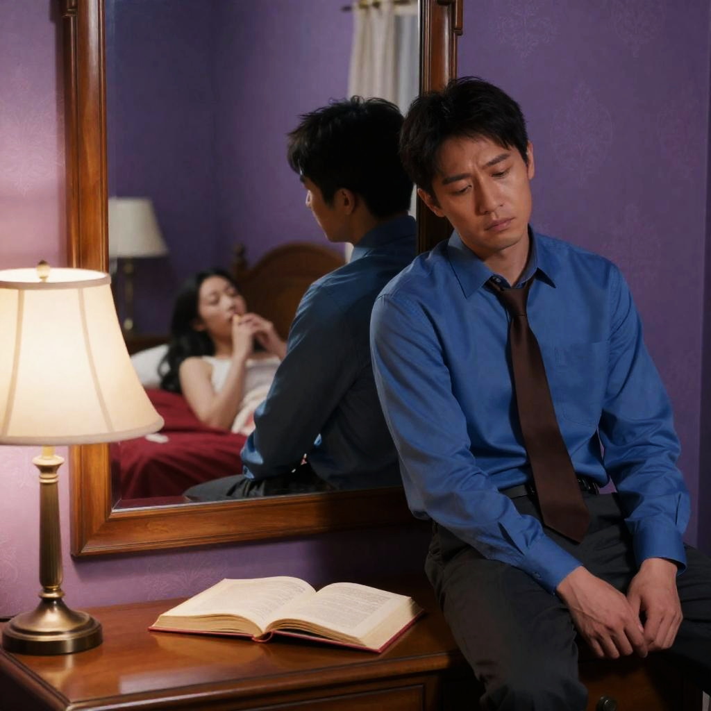 Photograph of a man in a dark robe pointing at a woman in a green robe lying on a couch. Blue doors in the background. Man's shadow on door. Woman looks up at man. Indoor setting.