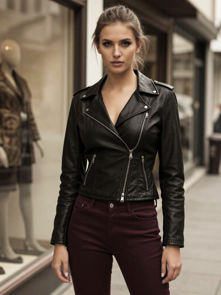 Photograph of a young woman standing on a city sidewalk. She has fair skin, brown hair tied back, and wears a black leather jacket with silver zippers, partially unzipped to reveal a hint of a white top. She pairs the jacket with dark maroon pants. Her expression is neutral, with a slight gaze towards the camera. The background shows a storefront with a mannequin wearing a patterned jacket, and blurred pedestrian activity. The overall style is urban and edgy, with a focus on the woman's confident, stylish appearance. The lighting is natural, with a slightly overcast effect.