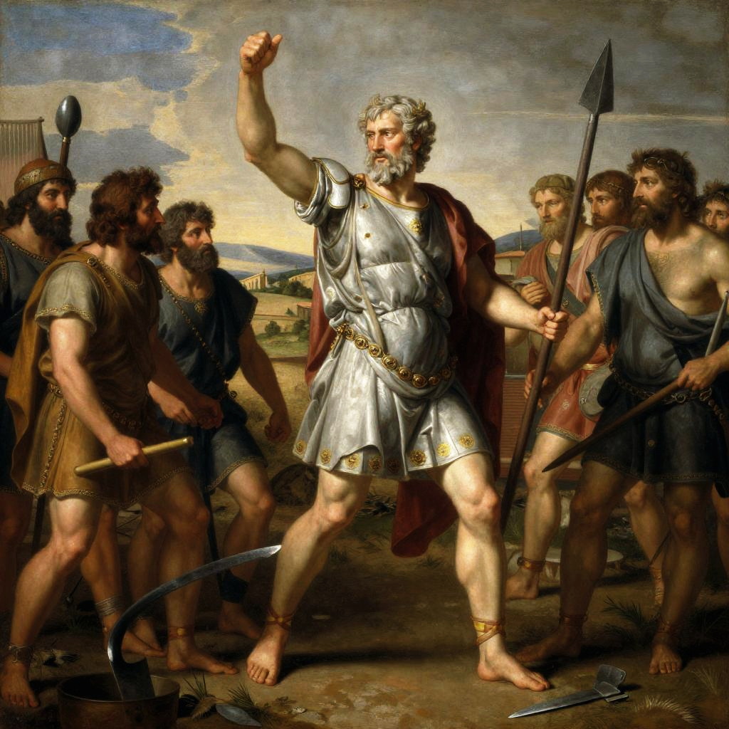 Romulus depicted in a dramatic scene, founding Rome with a plow, surrounded by early settlers, ancient tools, and the rugged Italian landscape, with rich earth tones and a historical epic vibe captured in classical art style.
