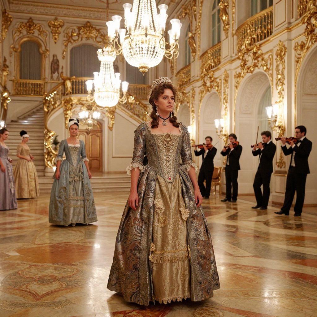 Burgesia class at an exclusive 19th century ballroom, intricate period costumes, polished marble floors, grand staircase, festive atmosphere with chandeliers and violin players, baroque style, warm golden tones