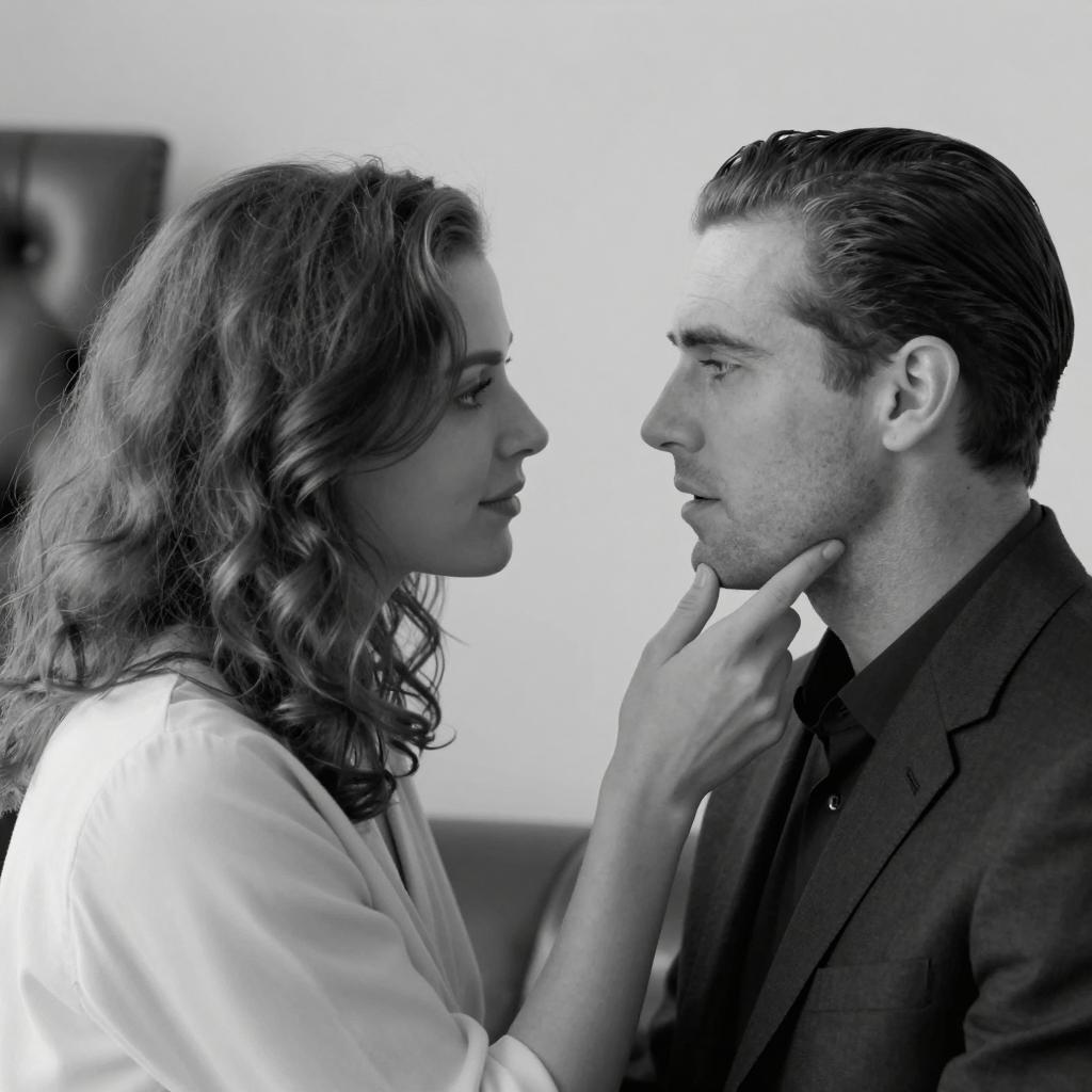 Black and white photograph of a man and woman. Man with dark, wavy hair, closed eyes, smoking cigarette held by woman. Woman with light, wavy hair, white blouse, hand gently touching man's chin. Man wears ured, light-colored coat. Background includes wooden paneling. Woman looks up at man with neutral expression.