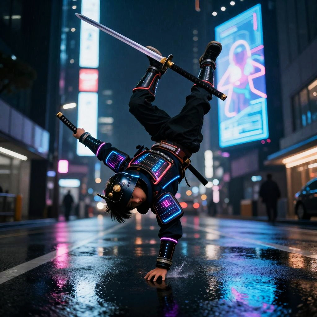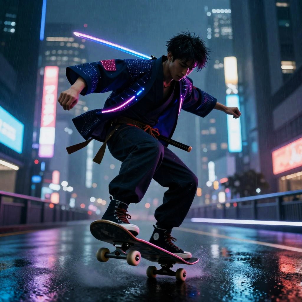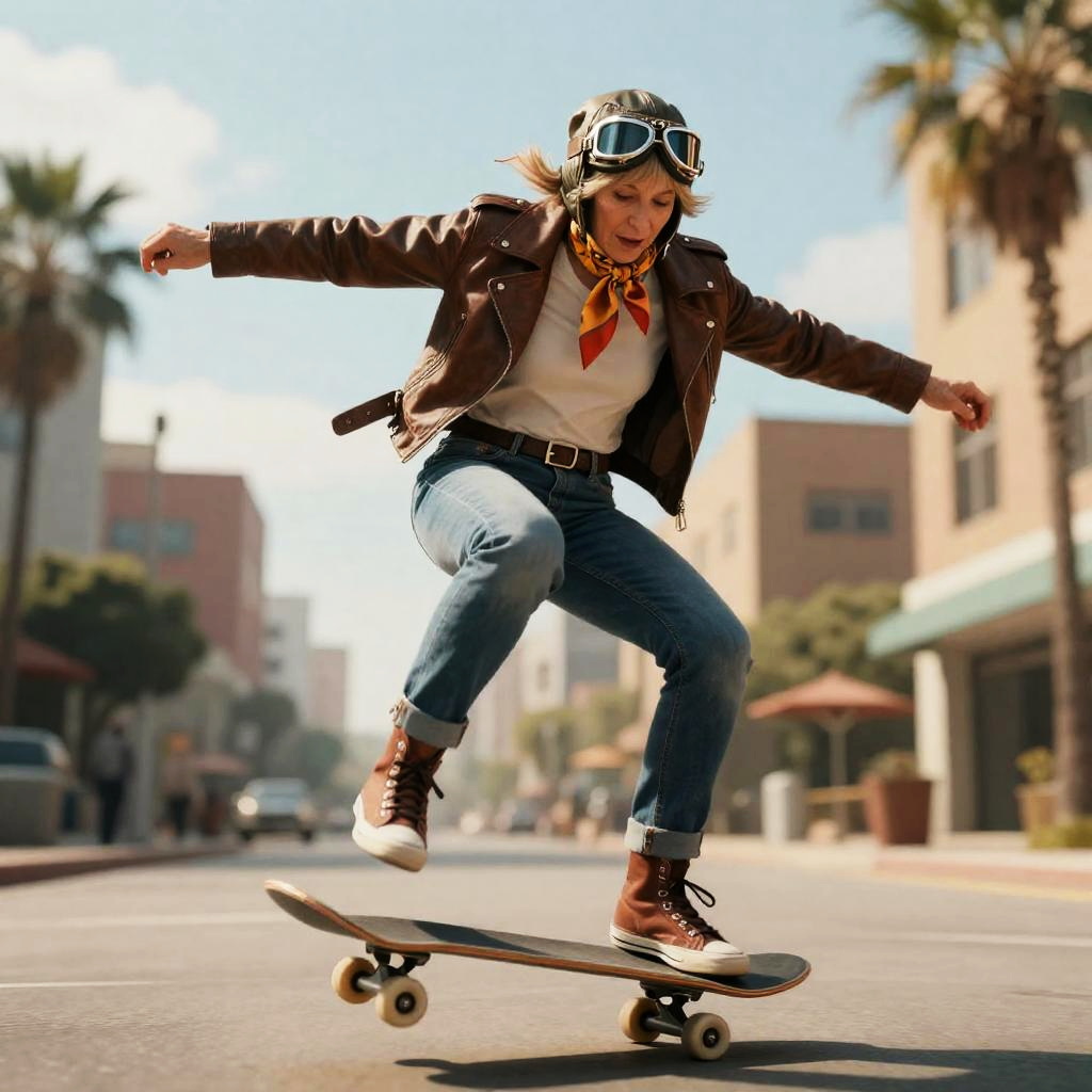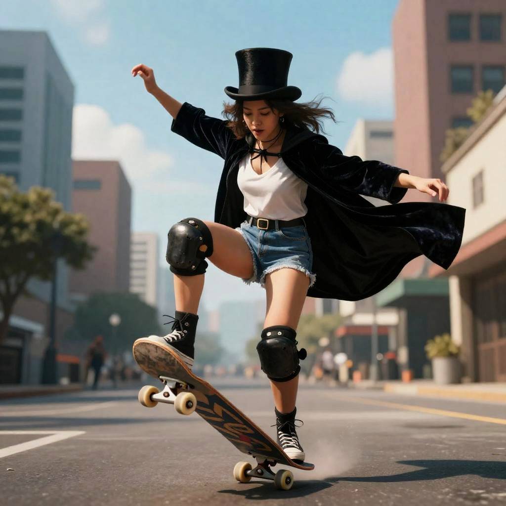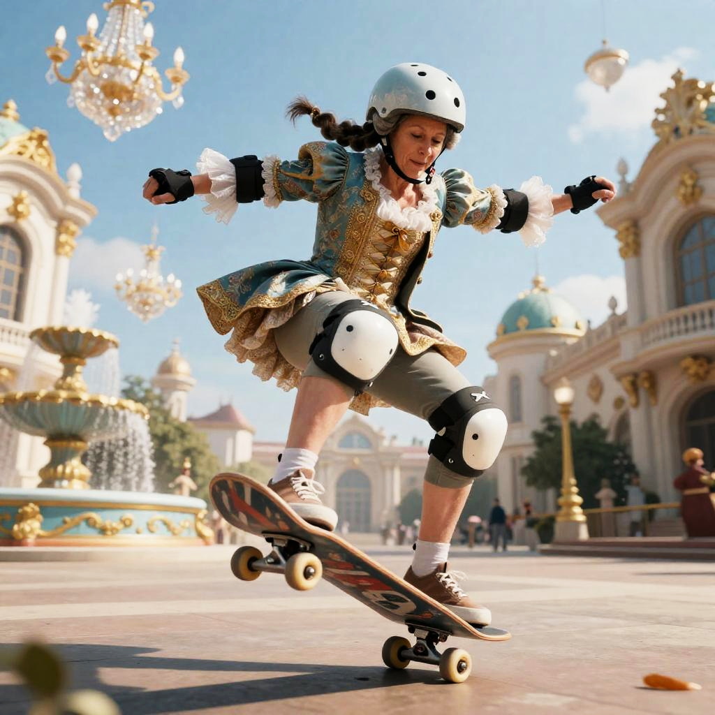 A middle-aged drag queen in a glittering sequined gown adapted for skatewear (high-top sneakers, knee pads, dramatic makeup) showcasing an impressive bluntslide along a neon-edged ledge on a skateboard against a surreal floating subway platforms with oversized holographic billboards. Enhanced with cinematic color grading, the scene exudes intense energy and movement, rendered in Unreal Engine 5 with photorealistic detail.