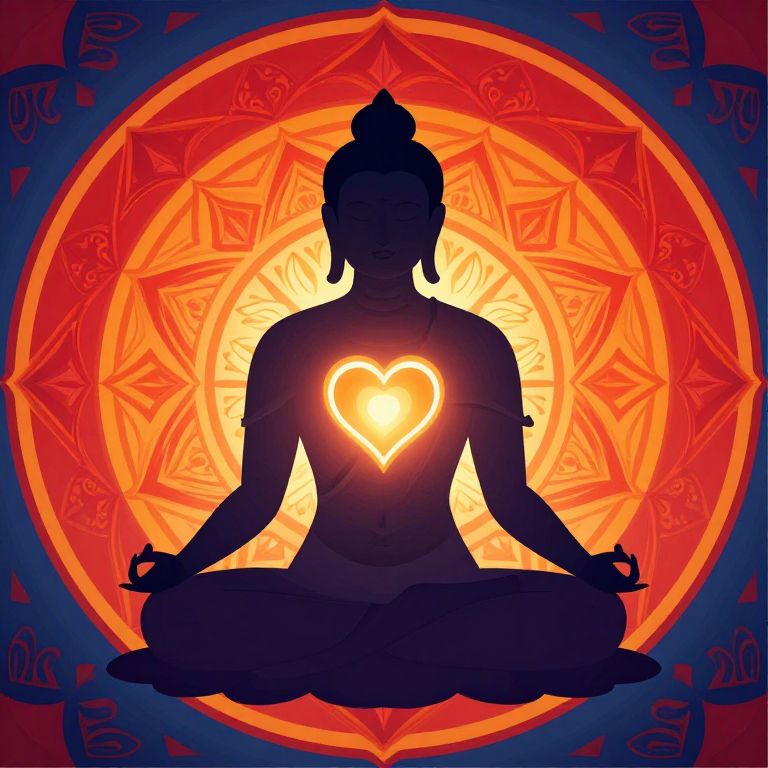 A vibrant vector illustration depicts a silhouette in lotus position, adorned with a glowing heart chakra, set against a colorful, ornate mandala featuring intricate red and orange patterns, symbolizing inner love, light, and peace in a Buddhist-inspired theme.