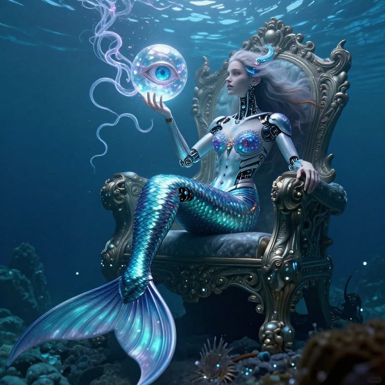 A surreal futuristic portrait captures a cybernetic mermaid seated on an otherworldly throne, gazing into a crystal orb with one eye as she manipulates glowing tendrils with her opposite hand. The scene is viewed from an underwater perspective that reveals the intricate design of her mechanical tail undulating in sync with pulsating lights. This imaginative image blends elements of fantasy and science fiction to evoke wonder, intrigue, and admiration for the fusion of technology and enchantment.