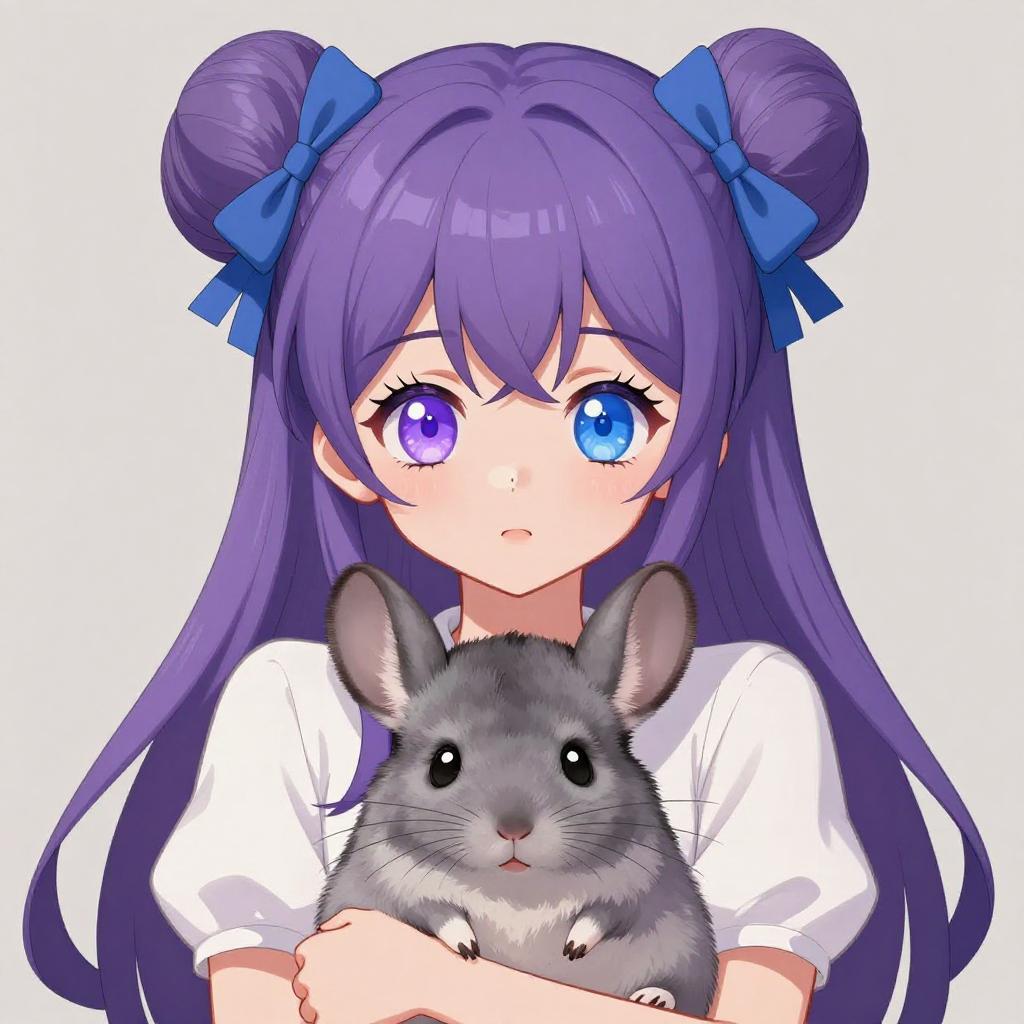 Digital anime-style illustration of a young girl with long purple hair styled in double buns with blue bows, wearing a white shirt. She has heterochromatic eyes, one purple and one blue, and is gently holding a plump gray chinchilla. The background is simple and neutral, highlighting the characters.