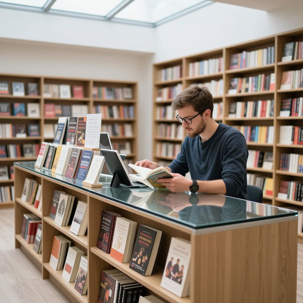Photograph of a library aisle lined with tall, white bookshelves filled with colorful books. In the foreground, two women with curly brown hair, wearing black jackets and blue jeans, stand on either side, searching for books. One holds a book, while the other reads a title. In the background, three more people, dressed in winter clothing, are browsing. The floor is gray tile, and the ceiling has bright fluorescent lights, creating a well-lit, focused environment. The image captures a quiet, studious atmosphere with an orderly arrangement of books.