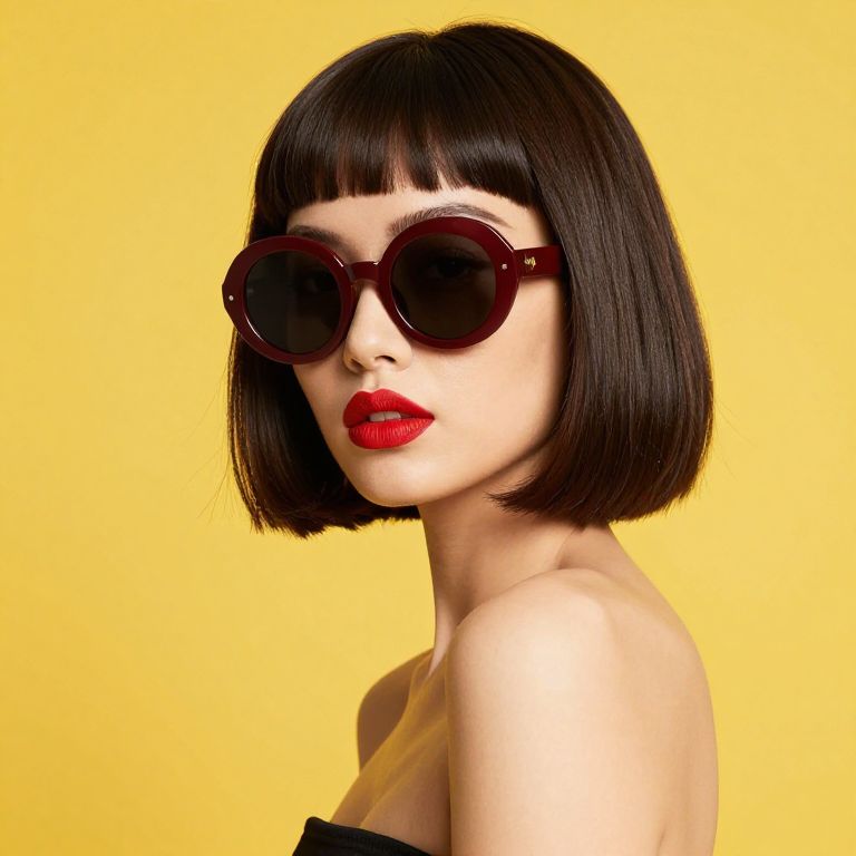 Daringly styled oversized retro-inspired round sunglasses in a bold maroon frame complement a confident pose against a vibrant yellow backdrop, accentuating bold red lipstick and a chic bob hairstyle.