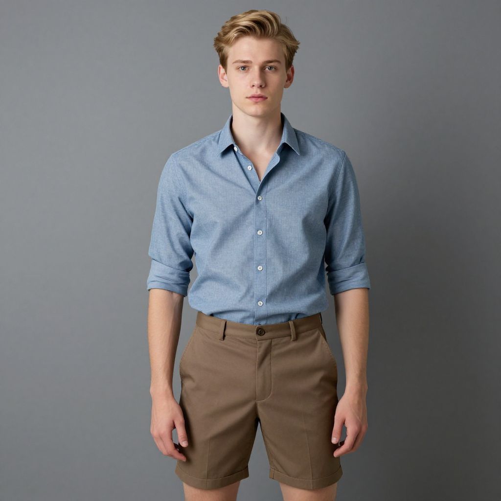 "clothes short costume, 1boy, male focus, solo, shorts, shirt, blonde hair, brown shorts, standing, blue shirt, realistic, short sleeves Realistic photo of casual sexy person with pretty face"