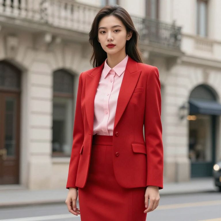 Highneck ootd featuring a bold red high-neck crop top with wide-leg trousers, modern cityscape background, dynamic pose, streetwear meets fashion, vibrant color palette, high contrast, sharp details, MidJourney render.