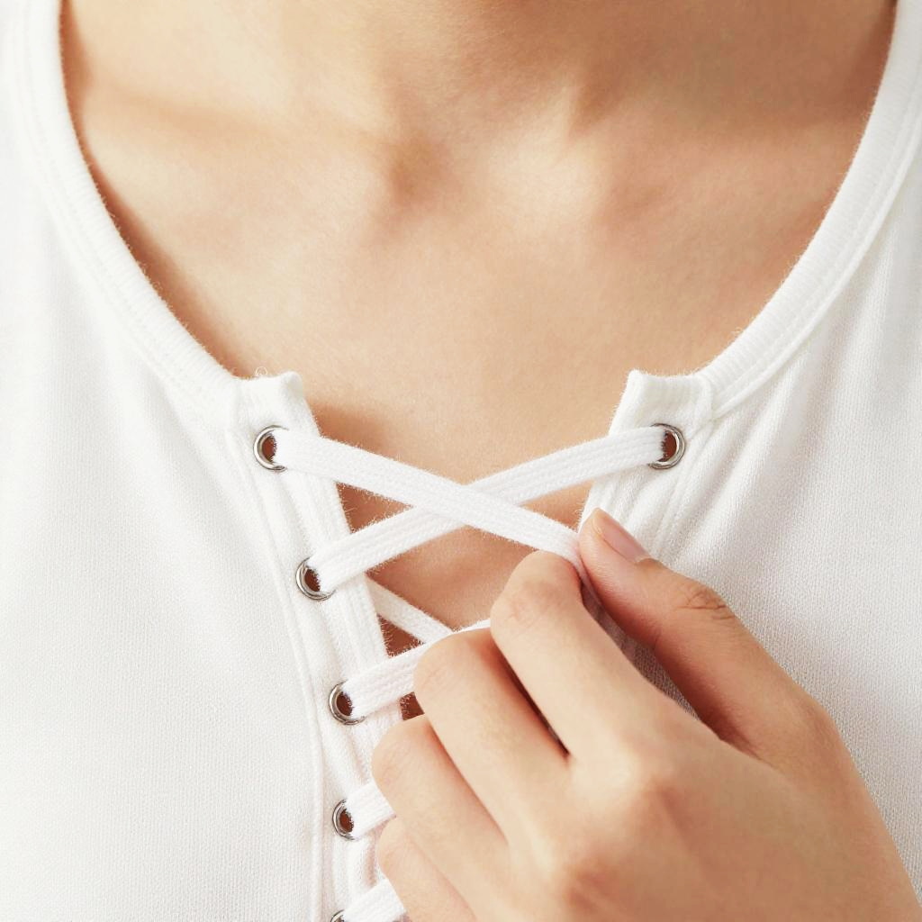 Close-up photo of a light-skinned person's torso, focusing on the area where a white laced-up top is partially undone. A hand with manicured nails is gently pulling on the lace, revealing a hint of skin. The laces create a crisscross pattern over the chest. The background is a plain, bright white, making the lace and hand stand out.