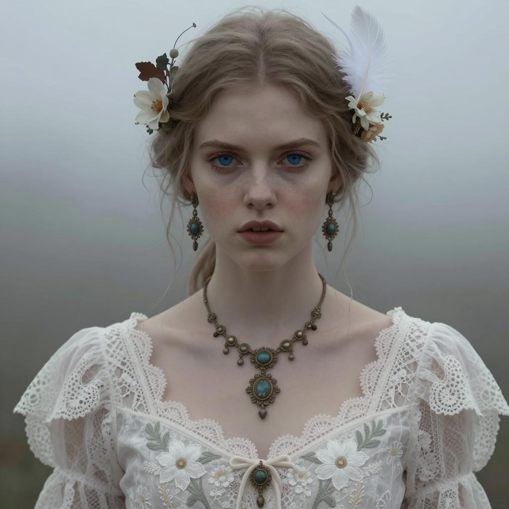 Digital illustration of a pale-skinned, fair-haired woman with blue eyes, wearing a white lace dress with floral embroidery. She has a detailed, ornate necklace and earrings, and her hair is adorned with flowers and feathers. Her expression is intense, with slightly parted lips. The background is a misty, grayish white with soft, blurred ures. Her shoulders are slightly raised, and her gaze is directed forward. The illustration style is highly detailed and realistic.