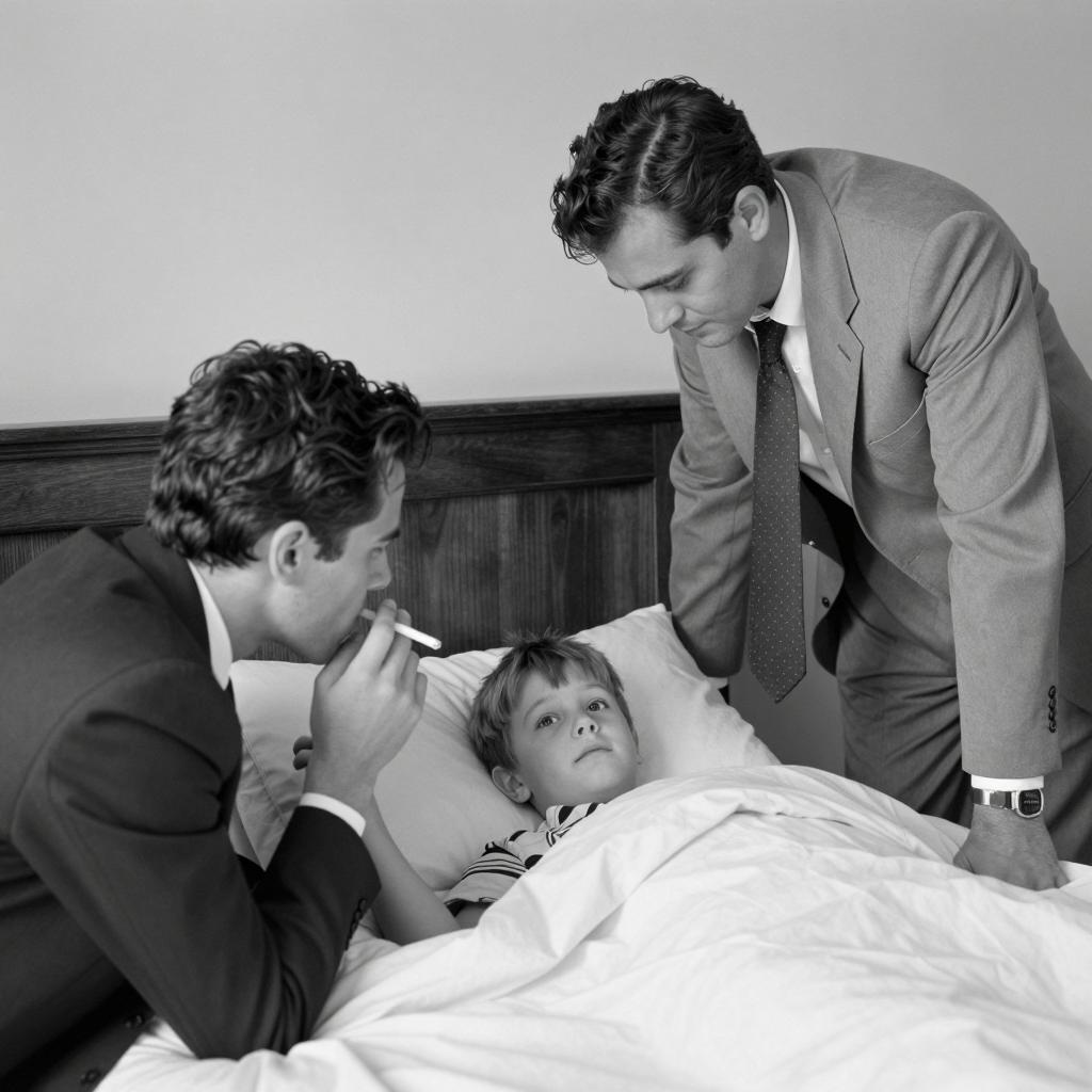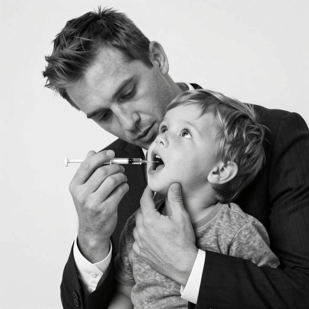 Black-and-white photograph of a man in a dark suit and tie holding a young child by the chin. Man is using a syringe on the child's mouth. Child has wide eyes looking upward. Man's left hand holds syringe, right hand grips child's chin. Man's hair is short and dark, child's hair is light. Background is plain white.