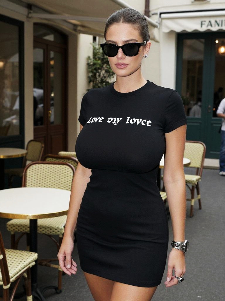 Photograph of a slender, white woman with a toned physique and large breasts wearing a tight, black, short-sleeve dress with "love my love" printed in white on the chest. She has dark sunglasses, her brown hair is slicked back, and she wears a silver watch and black rings. She stands on a street with outdoor café tables and chairs with yellow and brown upholstery in the background. A shop with a "FANCI" sign is visible in the distance. The lighting is bright, highlighting her outfit and accessories.